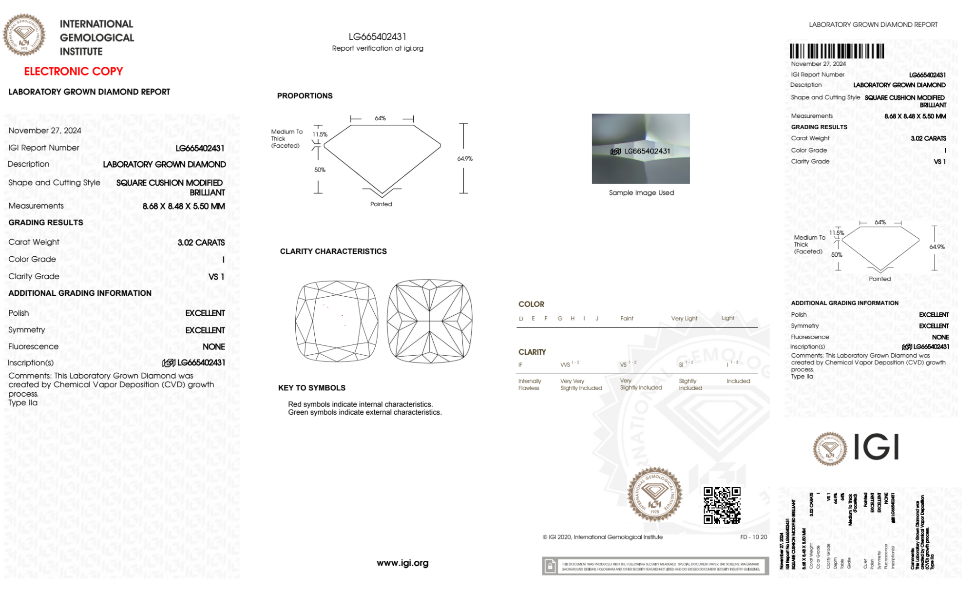 Your 3.02 carat Cushion lab diamond is graded I color (Near Colorless), and you can read more about I color diamonds here.