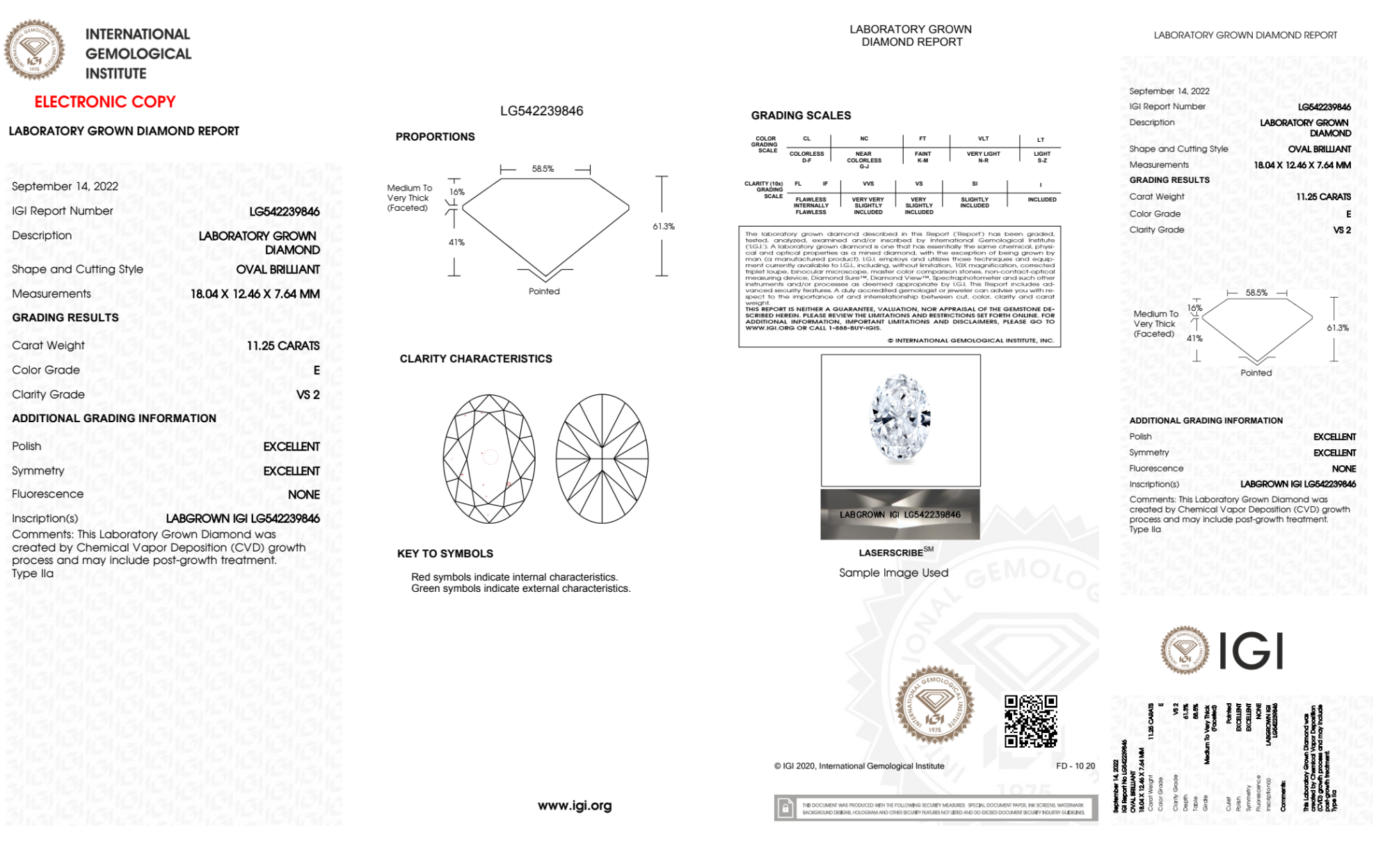 Your 11.25 carat Oval lab diamond is graded E color (Colorless), and you can read more about E color diamonds here.