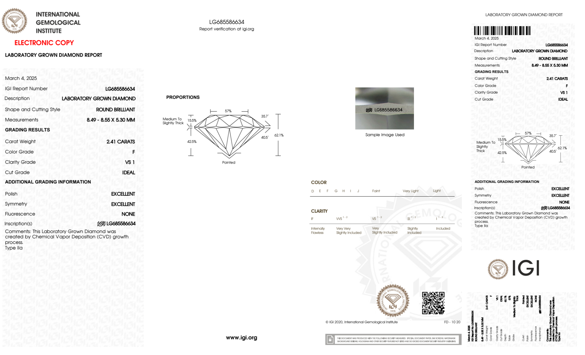 Your 2.41 carat Round lab diamond is graded F color (Colorless), and you can read more about F color diamonds here.