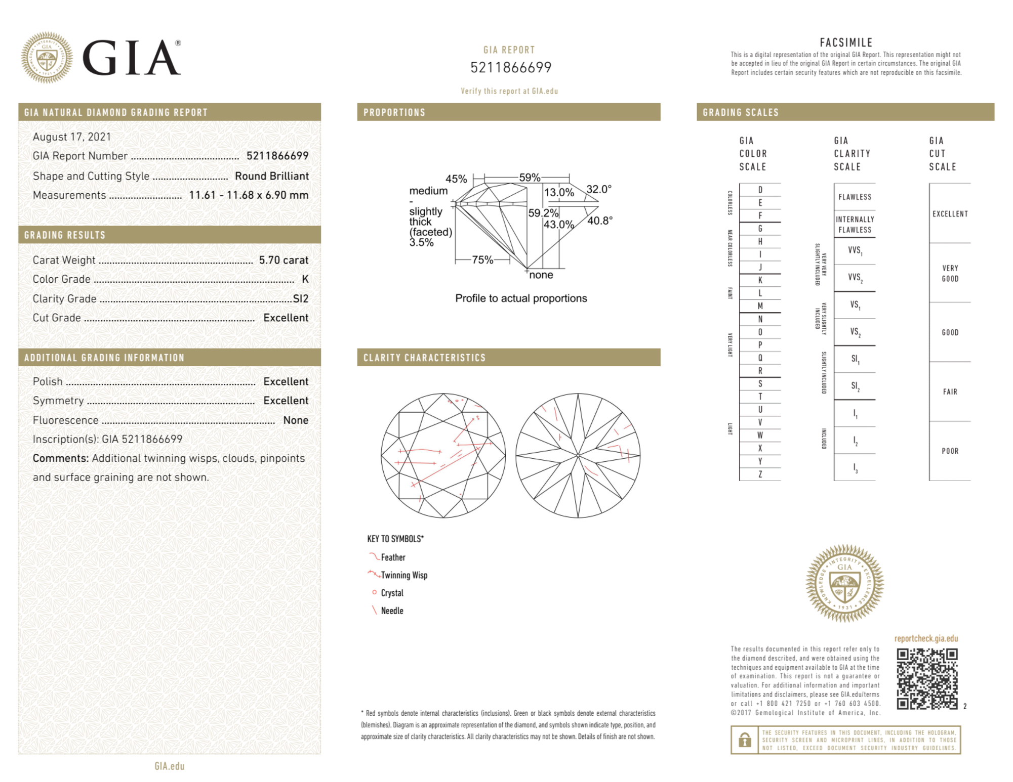 Your 5.70 carat Round natural diamond is graded SI2 clarity, which stands for Slightly Included 2. Read more about SI2 clarity diamonds here, or learn more about diamond clarity in general here.