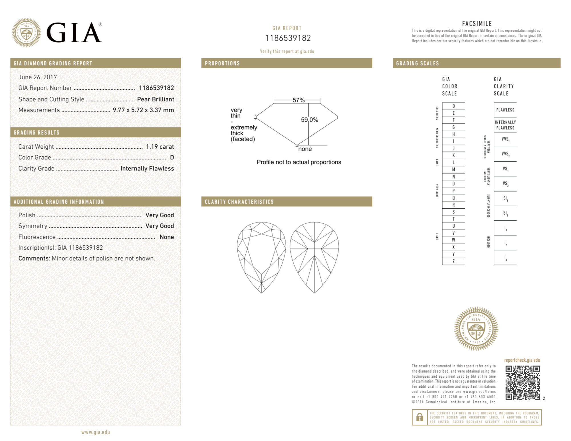 Your 1.19 carat Pear natural diamond is graded IF clarity, which stands for Internally Flawless. Read more about IF clarity diamonds here, or learn more about diamond clarity in general here.