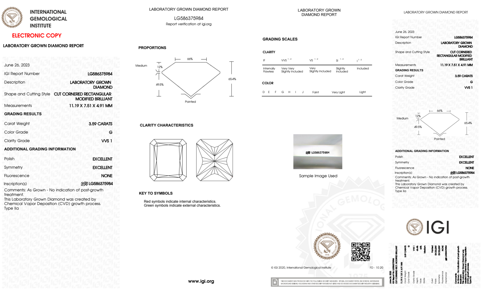 Your 3.59 carat Radiant lab diamond is graded G color (Near Colorless), and you can read more about G color diamonds here.