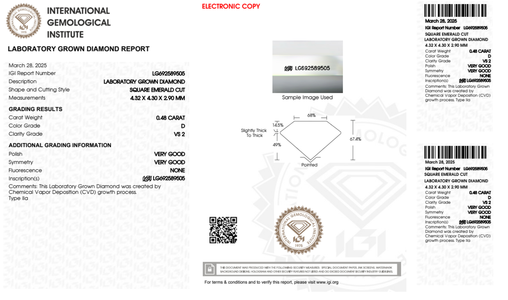 Your 0.48 carat Asscher lab diamond is graded D color (Colorless), and you can read more about D color diamonds here.