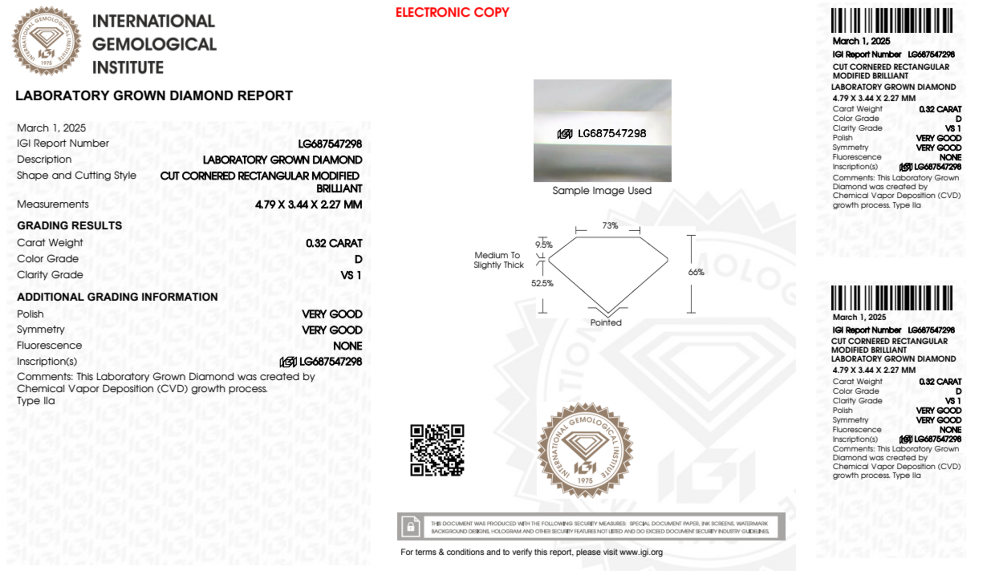 Your 0.32 carat Radiant lab diamond is graded D color (Colorless), and you can read more about D color diamonds here.