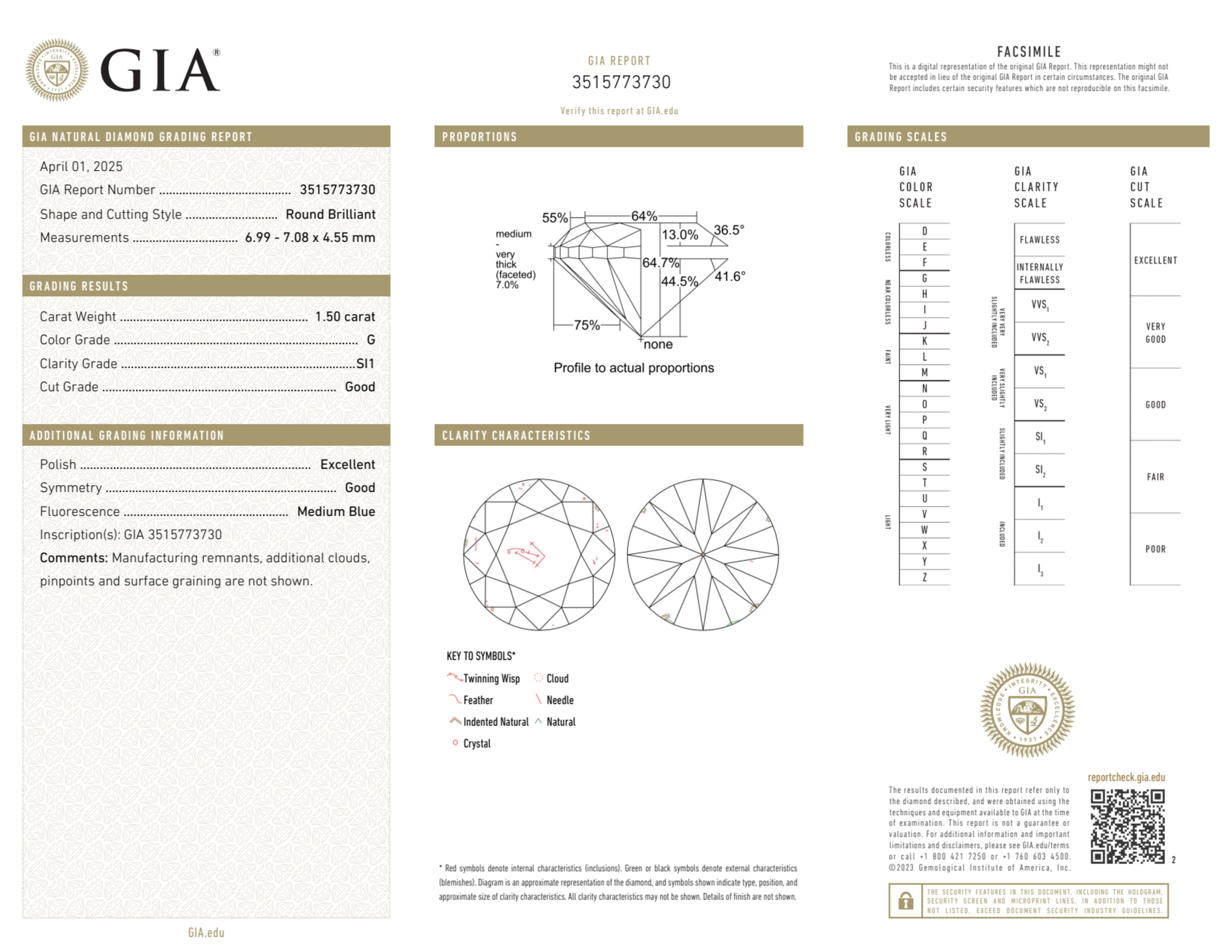 Your 1.50 carat Round natural diamond is graded SI1 clarity, which stands for Slightly Included 1. Read more about SI1 clarity diamonds here, or learn more about diamond clarity in general here.
