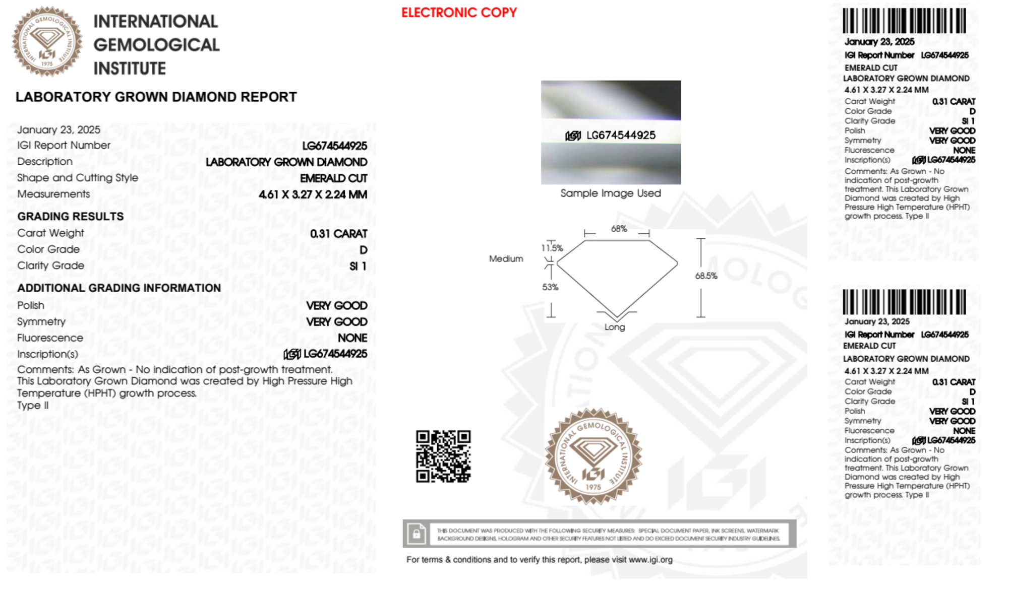 Your 0.31 carat Emerald lab diamond is graded SI1 clarity, which stands for Slightly Included 1. Read more about SI1 clarity diamonds here, or learn more about diamond clarity in general here.