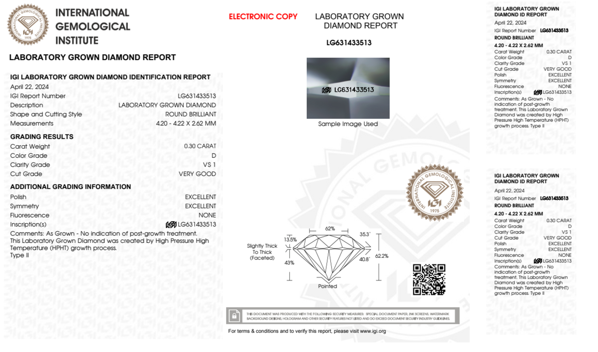 Your 0.30 carat Round lab diamond is graded VS1 clarity, which stands for Very Slightly Included 1. Read more about VS1 clarity diamonds here, or learn more about diamond clarity in general here.