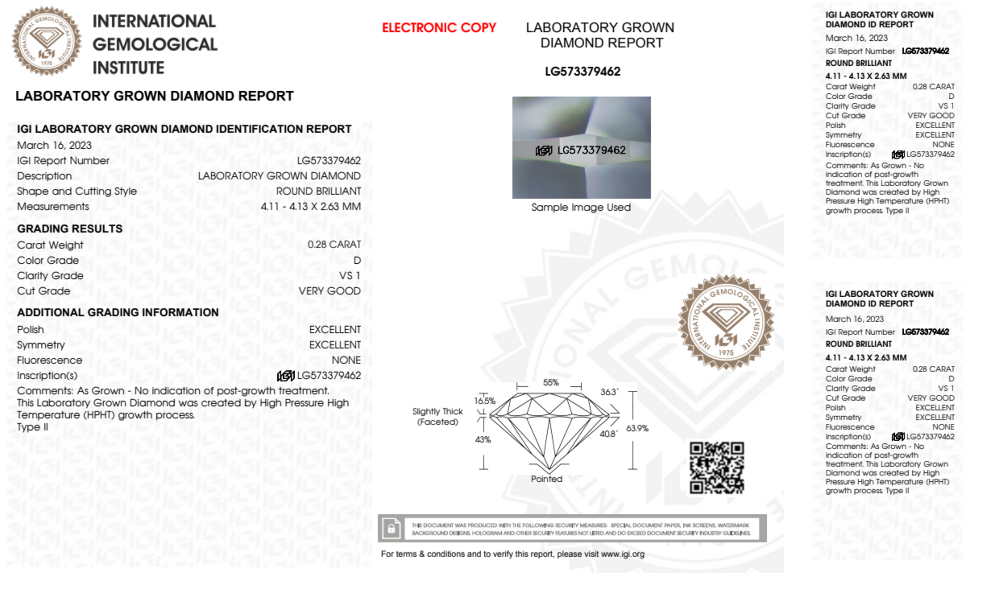Your 0.28 carat Round lab diamond is graded D color (Colorless), and you can read more about D color diamonds here.