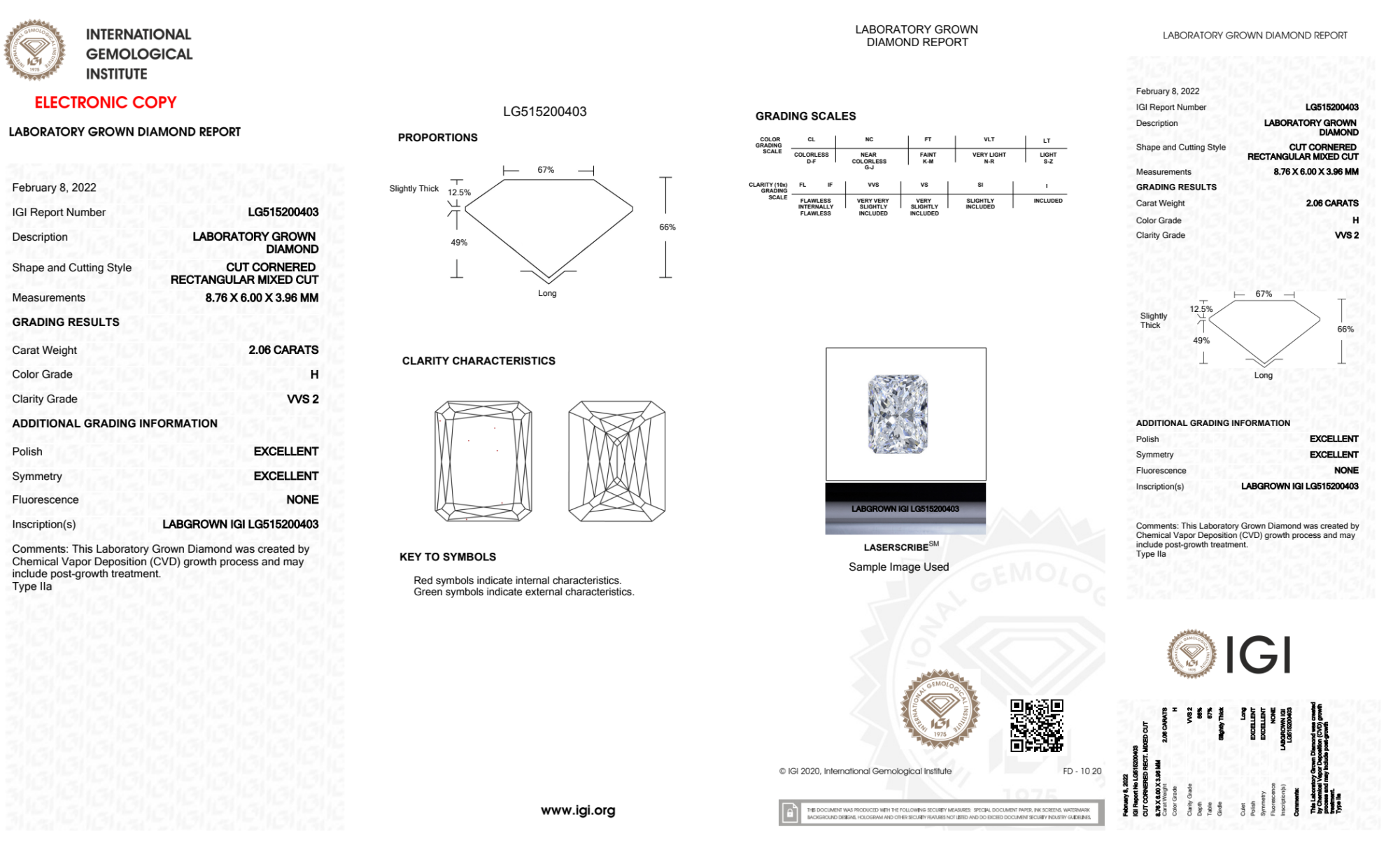 Your 2.06 carat Radiant lab diamond is graded H color (Near Colorless), and you can read more about H color diamonds here.