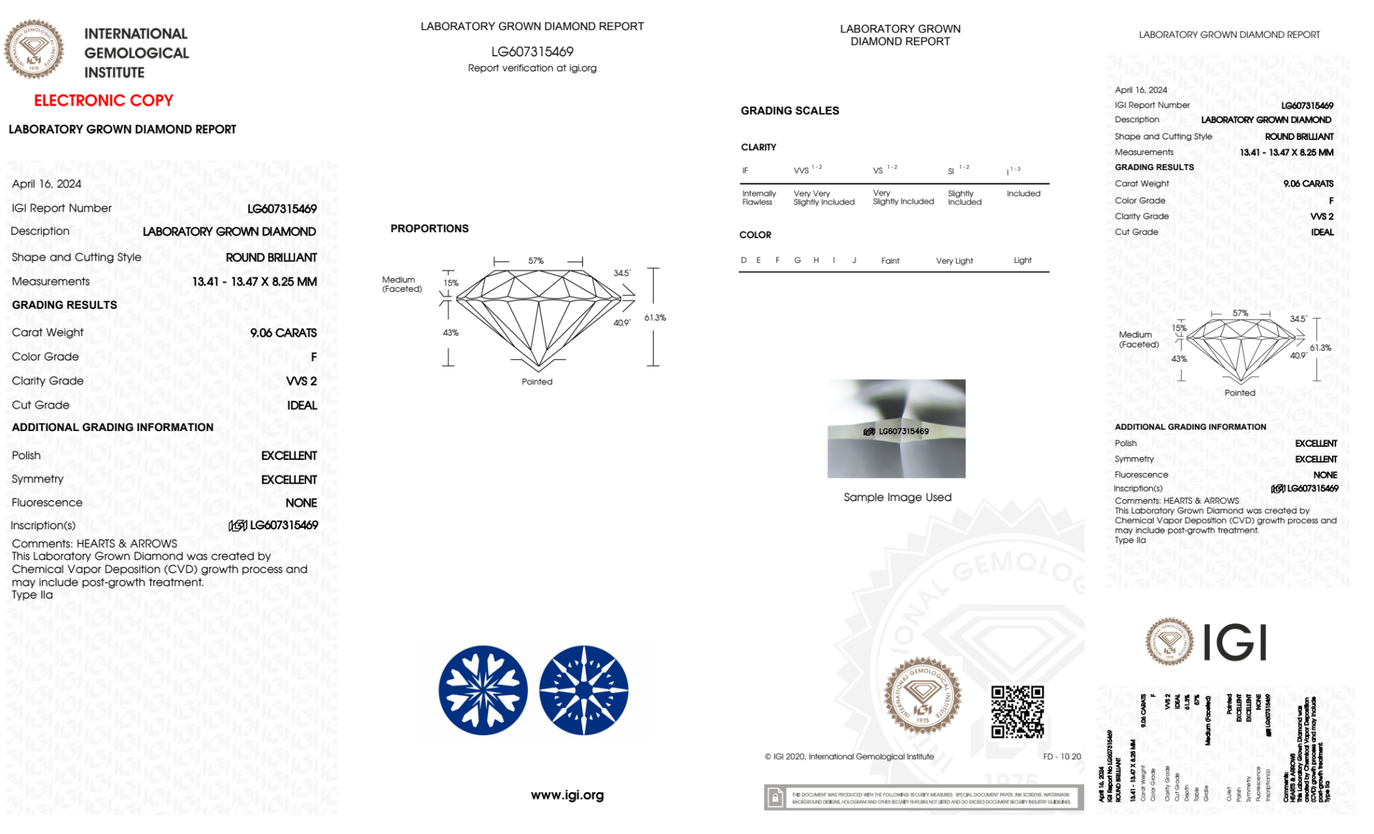 Your 9.06 carat Round lab diamond is graded F color (Colorless), and you can read more about F color diamonds here.
