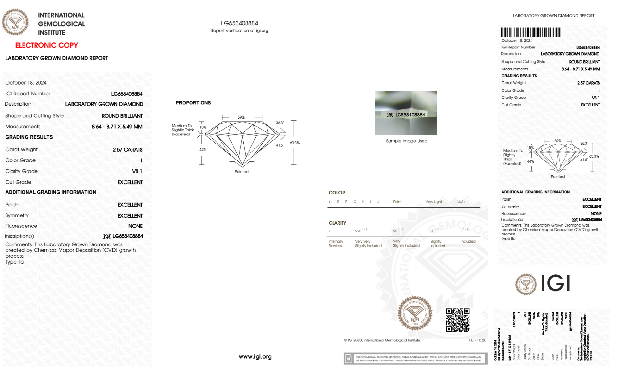 Your 2.57 carat Round lab diamond is graded I color (Near Colorless), and you can read more about I color diamonds here.