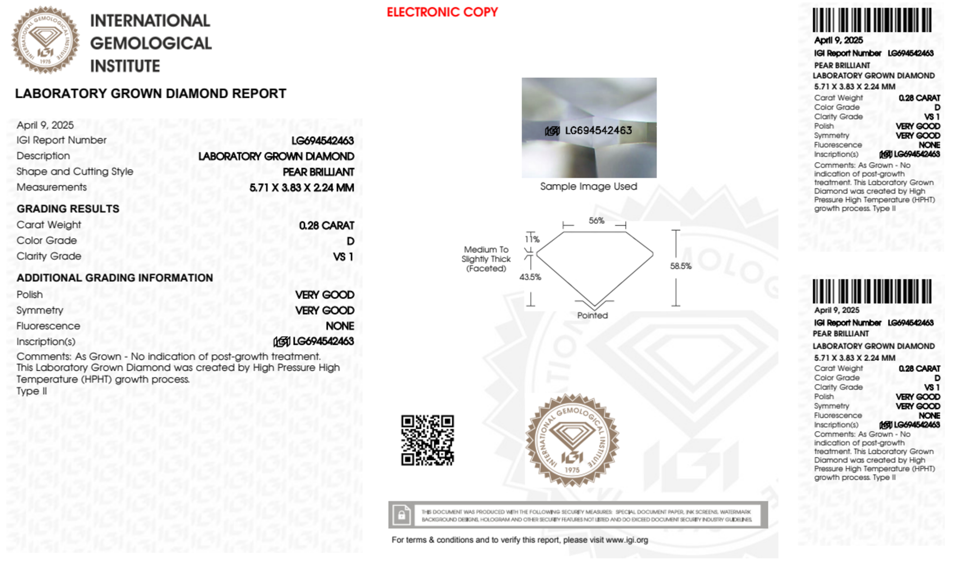 Your 0.28 carat Pear lab diamond is graded D color (Colorless), and you can read more about D color diamonds here.