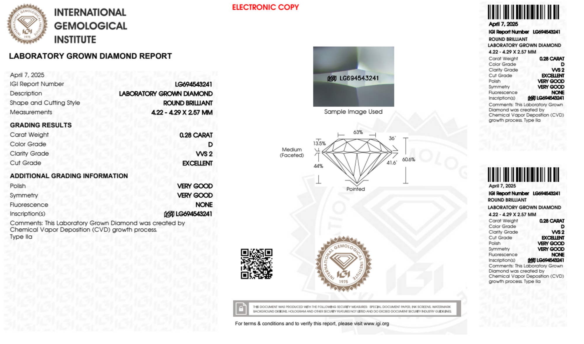 Your 0.28 carat Round lab diamond is graded D color (Colorless), and you can read more about D color diamonds here.