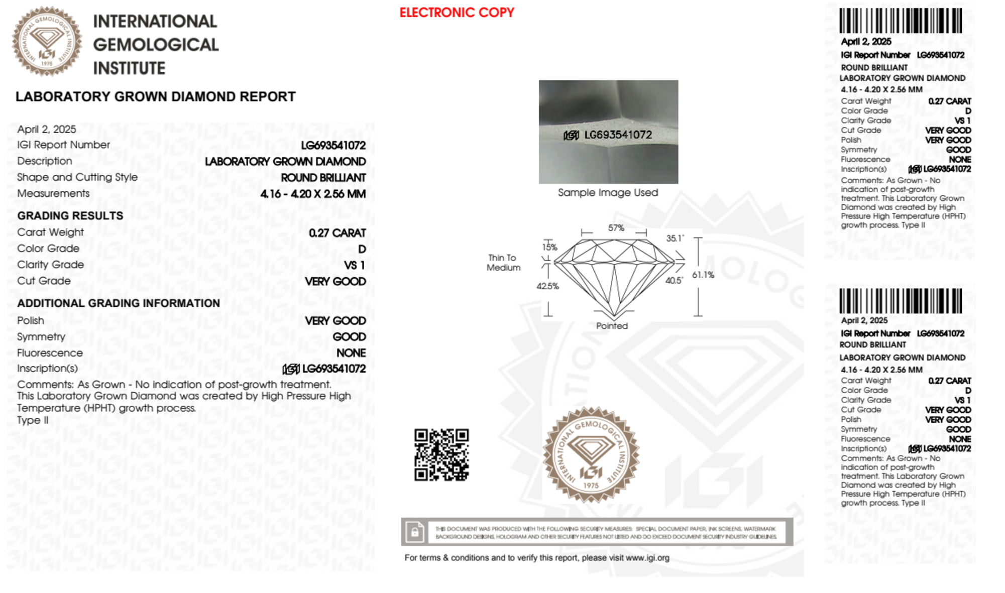 Your 0.27 carat Round lab diamond is graded D color (Colorless), and you can read more about D color diamonds here.