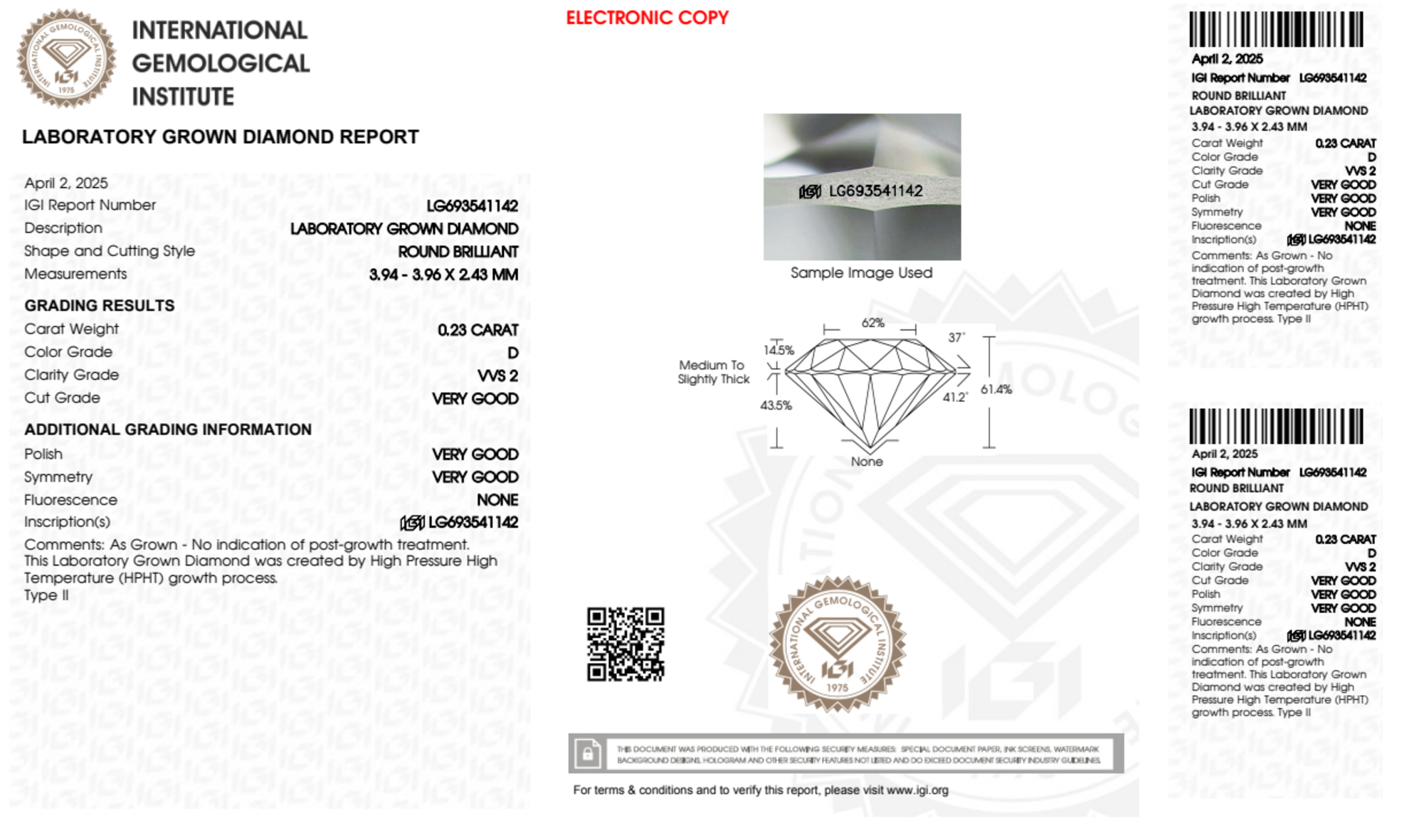 Your 0.23 carat Round lab diamond is graded D color (Colorless), and you can read more about D color diamonds here.