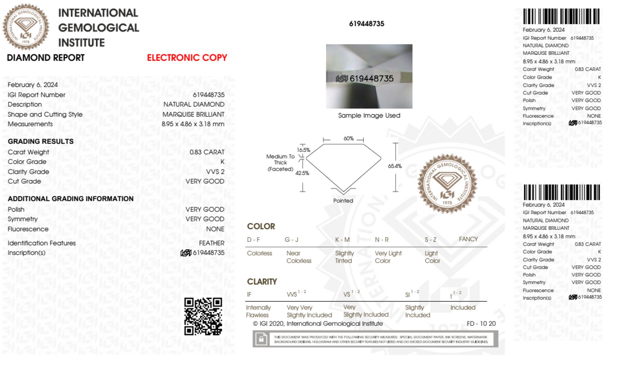 Your 0.83 carat Marquise natural diamond is graded K color (Faint Color), and you can read more about K color diamonds here.