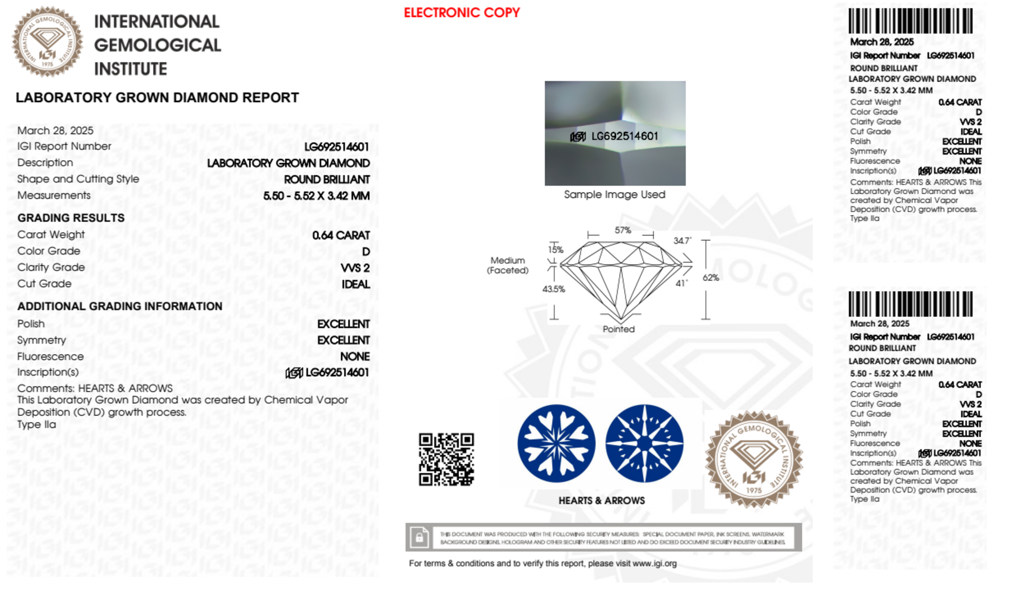 Your 0.64 carat Round lab diamond is graded D color (Colorless), and you can read more about D color diamonds here.