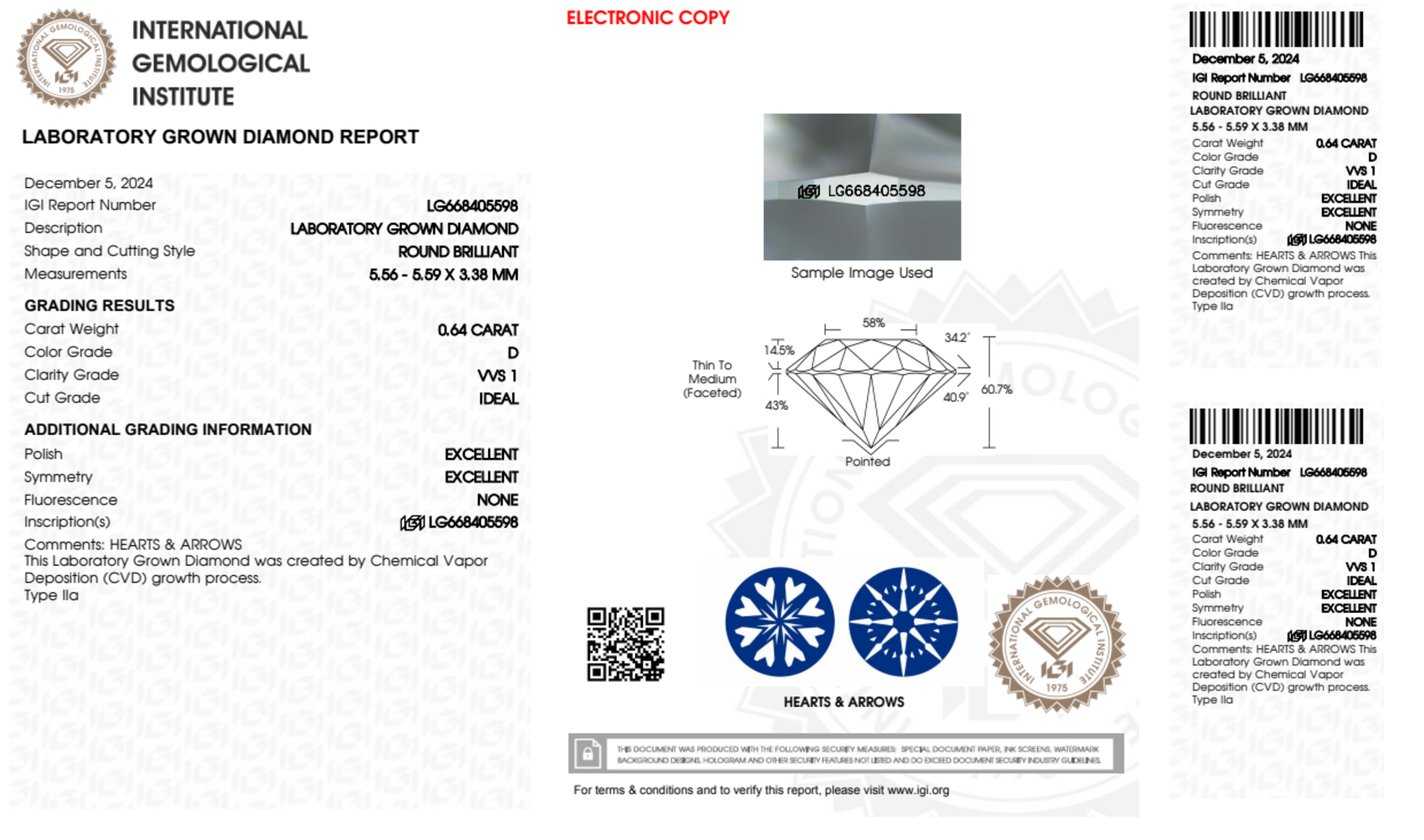 Your 0.64 carat Round lab diamond is graded D color (Colorless), and you can read more about D color diamonds here.