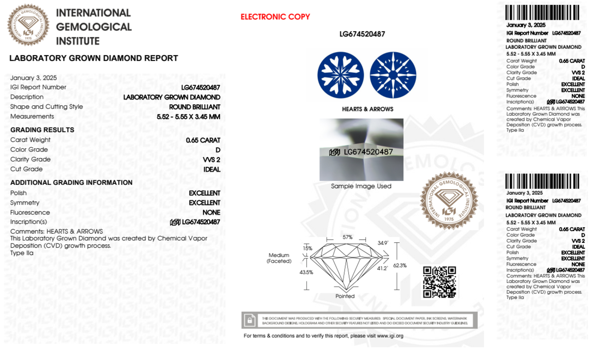 Your 0.65 carat Round lab diamond is graded D color (Colorless), and you can read more about D color diamonds here.