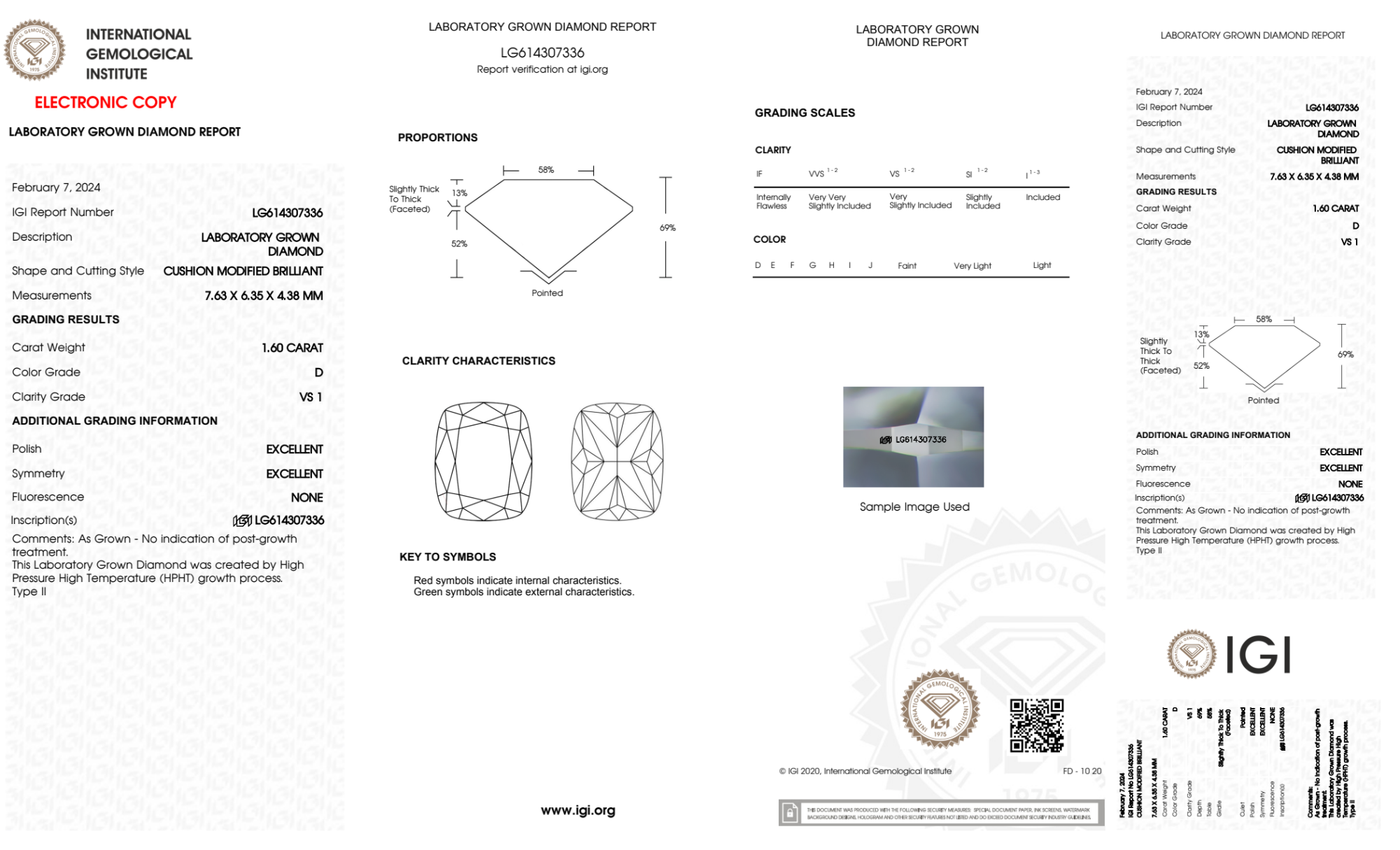 Your 1.60 carat Cushion lab diamond is graded D color (Colorless), and you can read more about D color diamonds here.