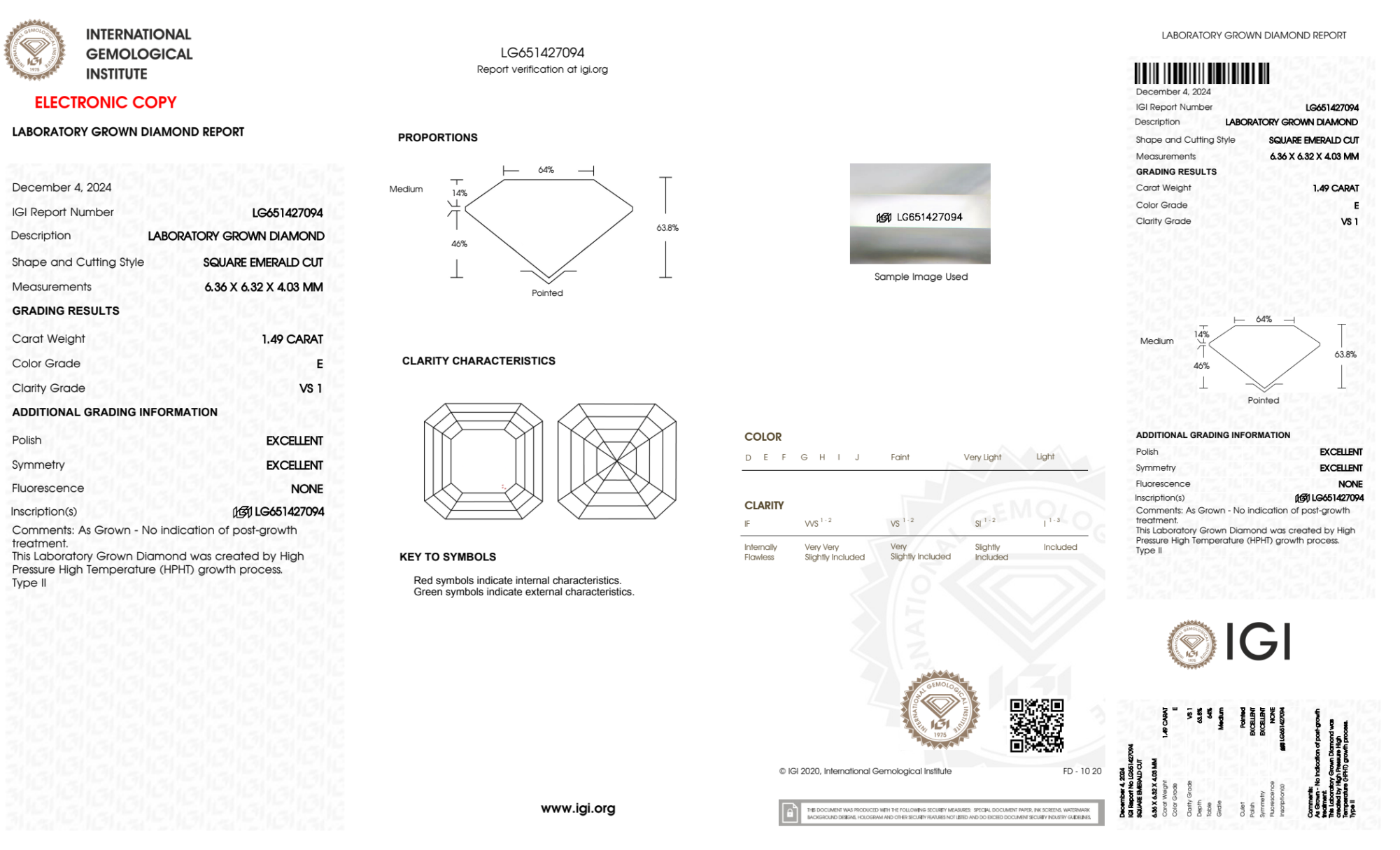 Your 1.49 carat Asscher lab diamond is graded E color (Colorless), and you can read more about E color diamonds here.