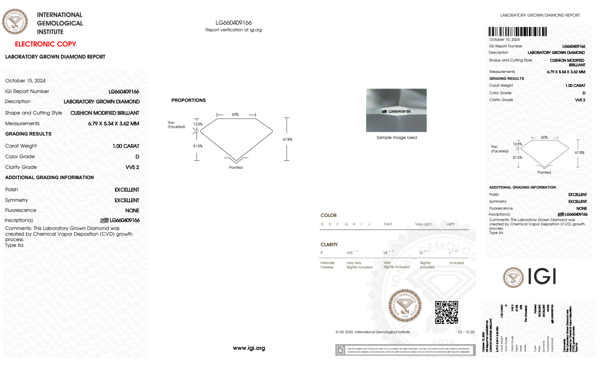 Your 1.00 carat Cushion lab diamond is graded D color (Colorless), and you can read more about D color diamonds here.