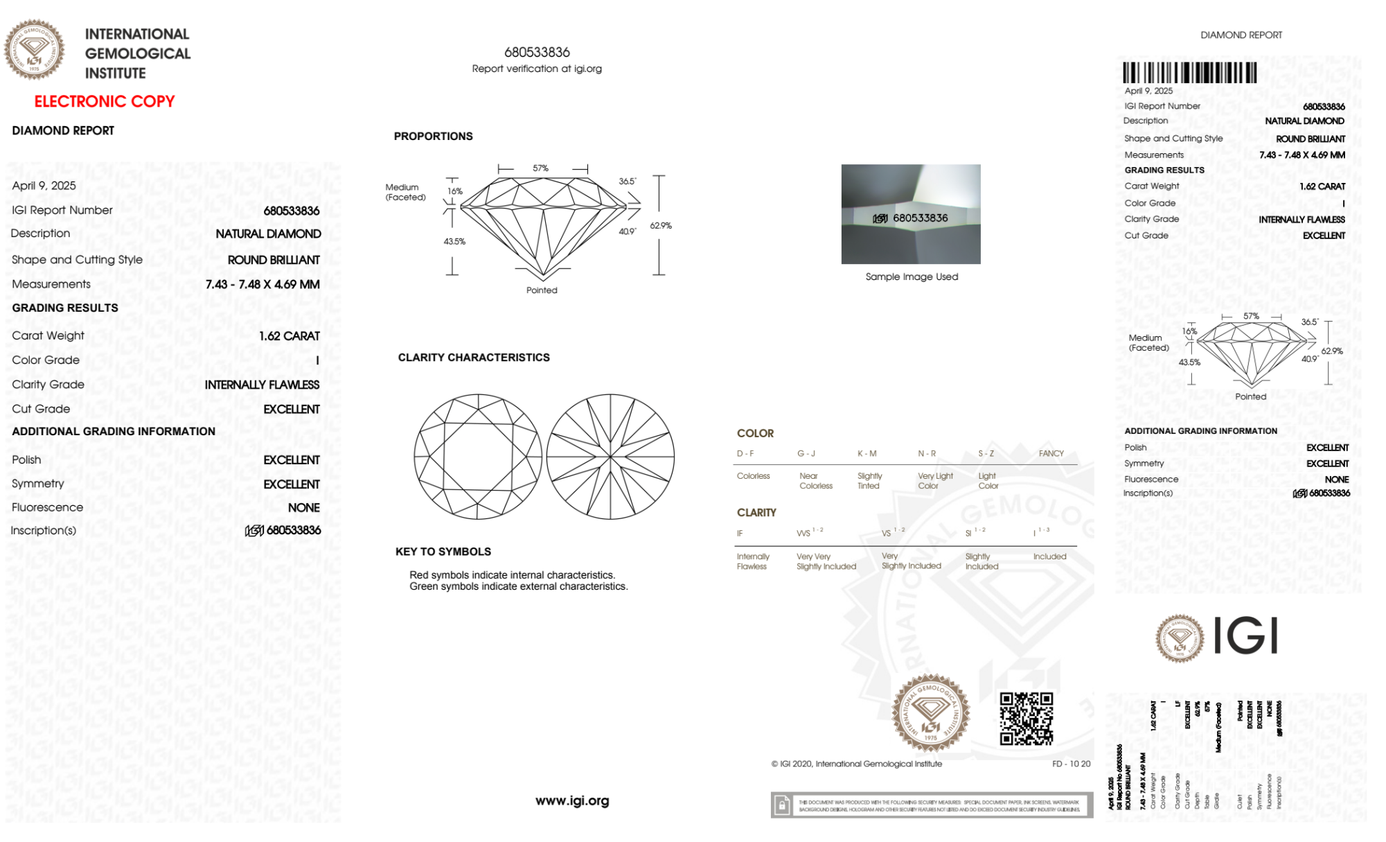 Your 1.62 carat Round natural diamond is graded IF clarity, which stands for Internally Flawless. Read more about IF clarity diamonds here, or learn more about diamond clarity in general here.