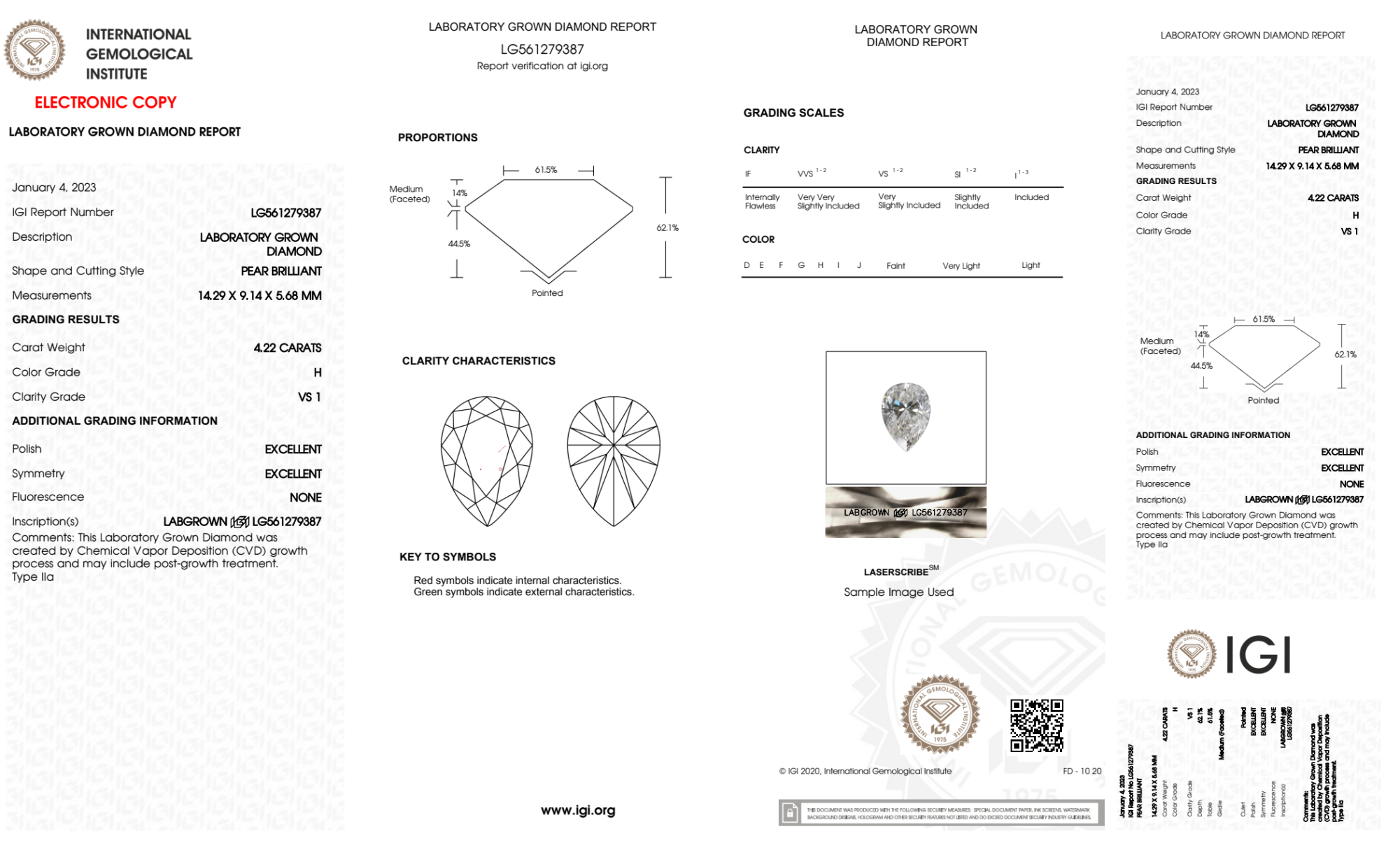 Your 4.22 carat Pear lab diamond is graded VS1 clarity, which stands for Very Slightly Included 1. Read more about VS1 clarity diamonds here, or learn more about diamond clarity in general here.