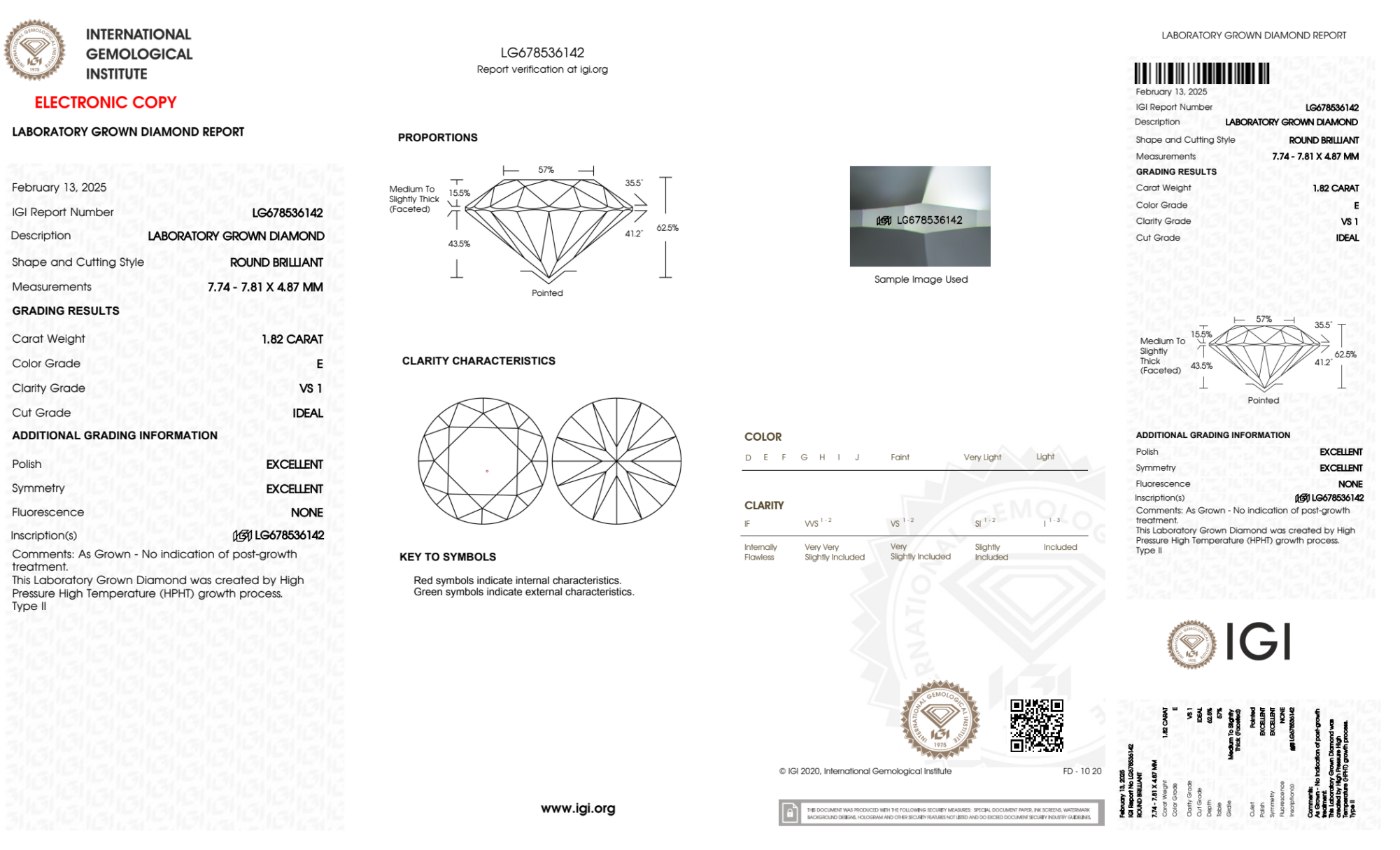 Your 1.82 carat Round lab diamond is graded E color (Colorless), and you can read more about E color diamonds here.