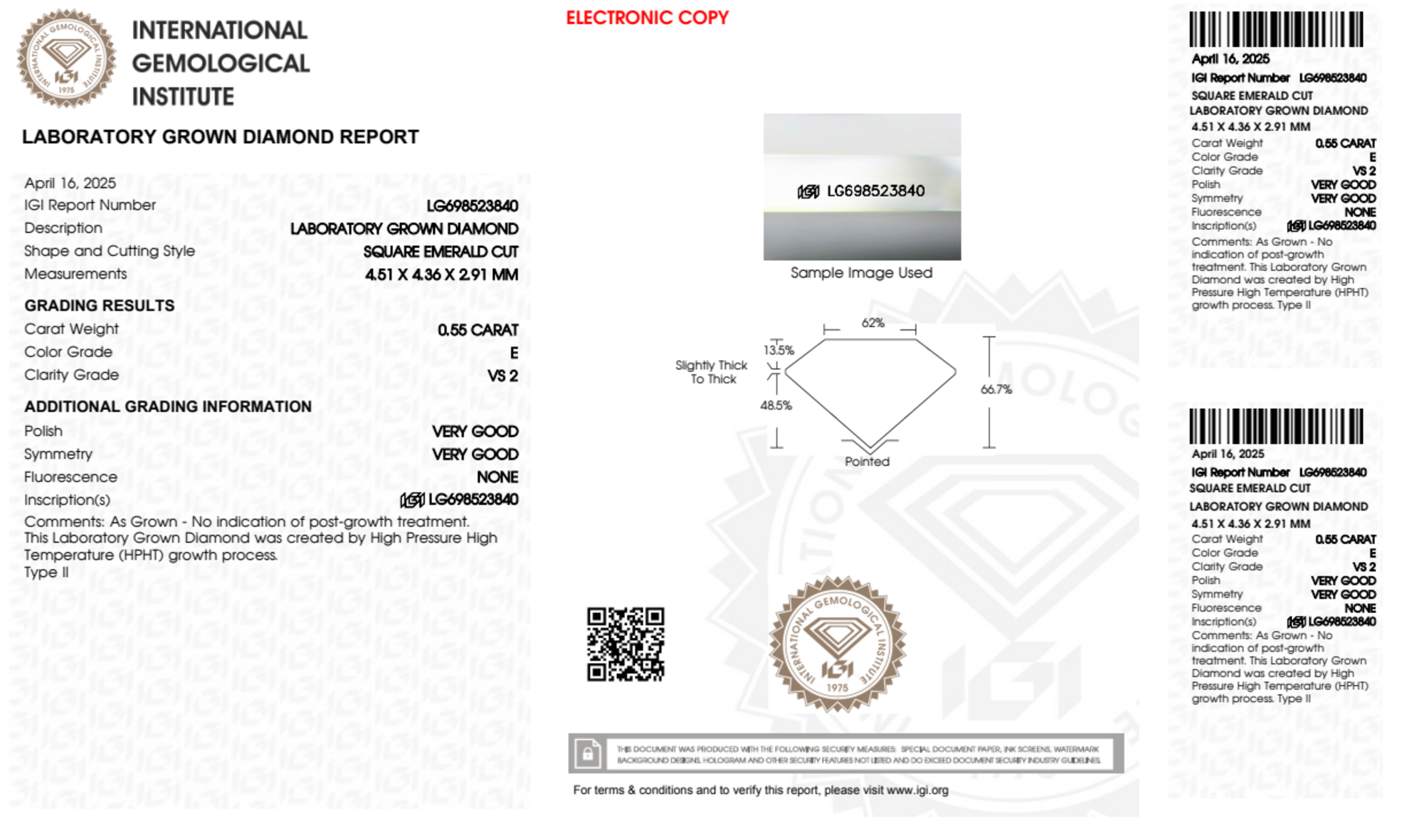 Your 0.55 carat Asscher lab diamond is graded E color (Colorless), and you can read more about E color diamonds here.