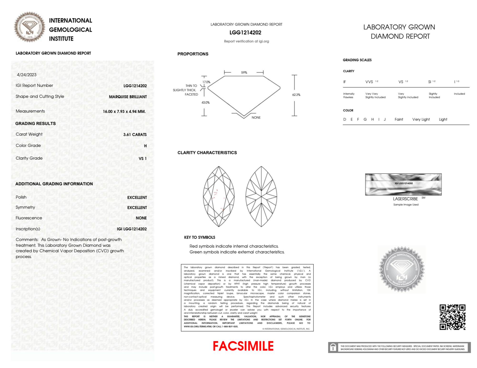 Your 3.61 carat Marquise lab diamond is graded VS1 clarity, which stands for Very Slightly Included 1. Read more about VS1 clarity diamonds here, or learn more about diamond clarity in general here.