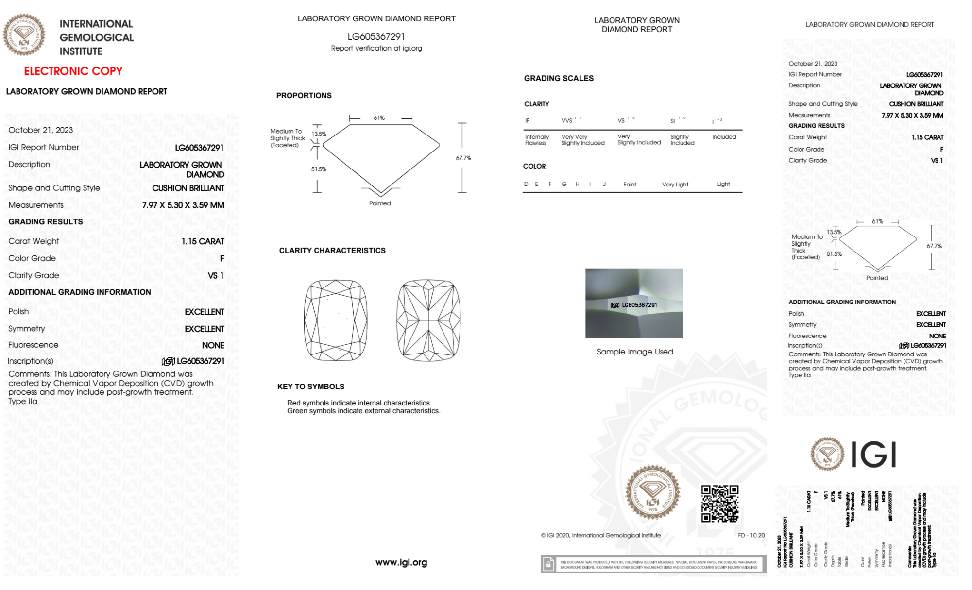 Your 1.15 carat Cushion lab diamond is graded F color (Colorless), and you can read more about F color diamonds here.