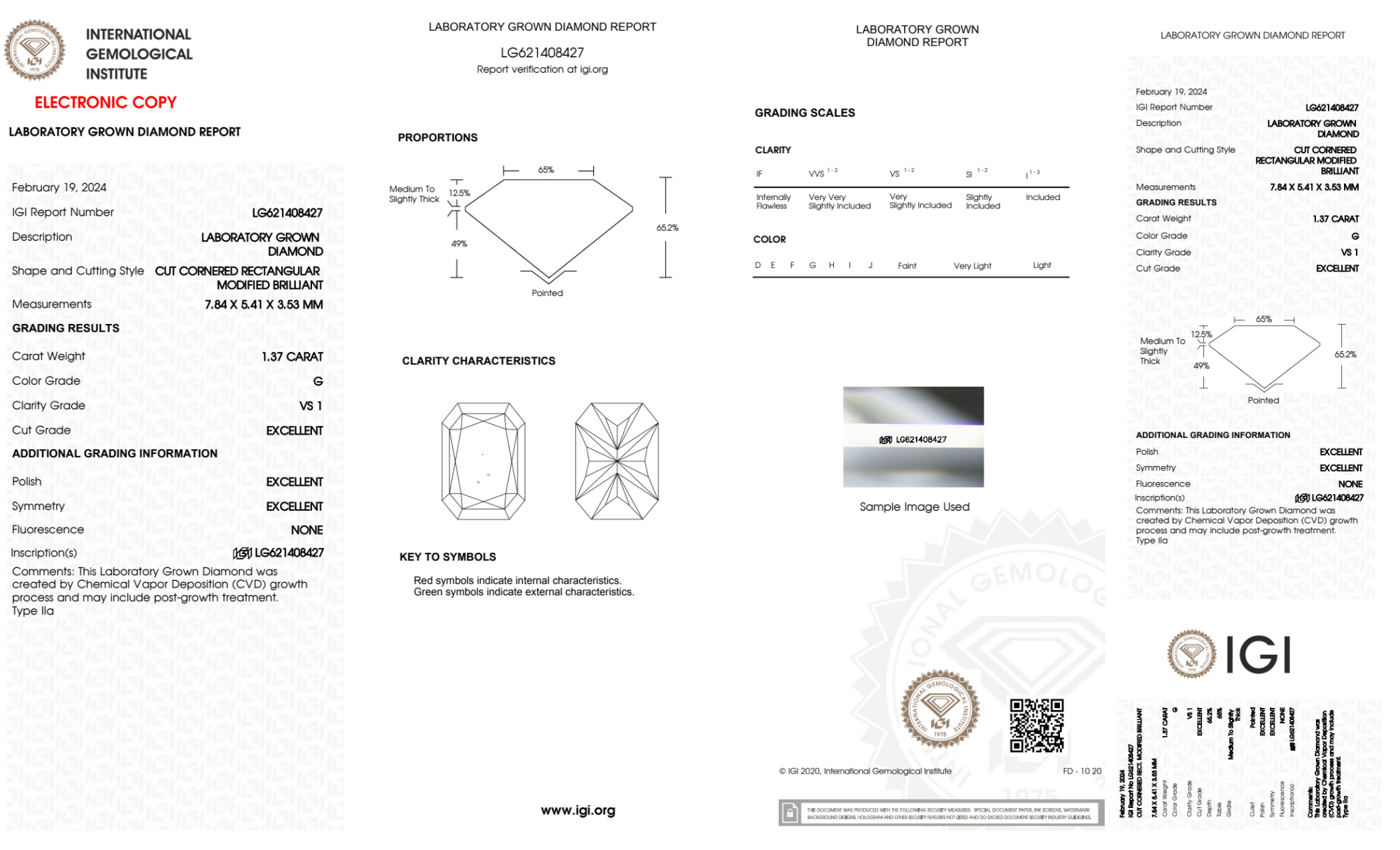 Your 1.37 carat Radiant lab diamond is graded G color (Near Colorless), and you can read more about G color diamonds here.