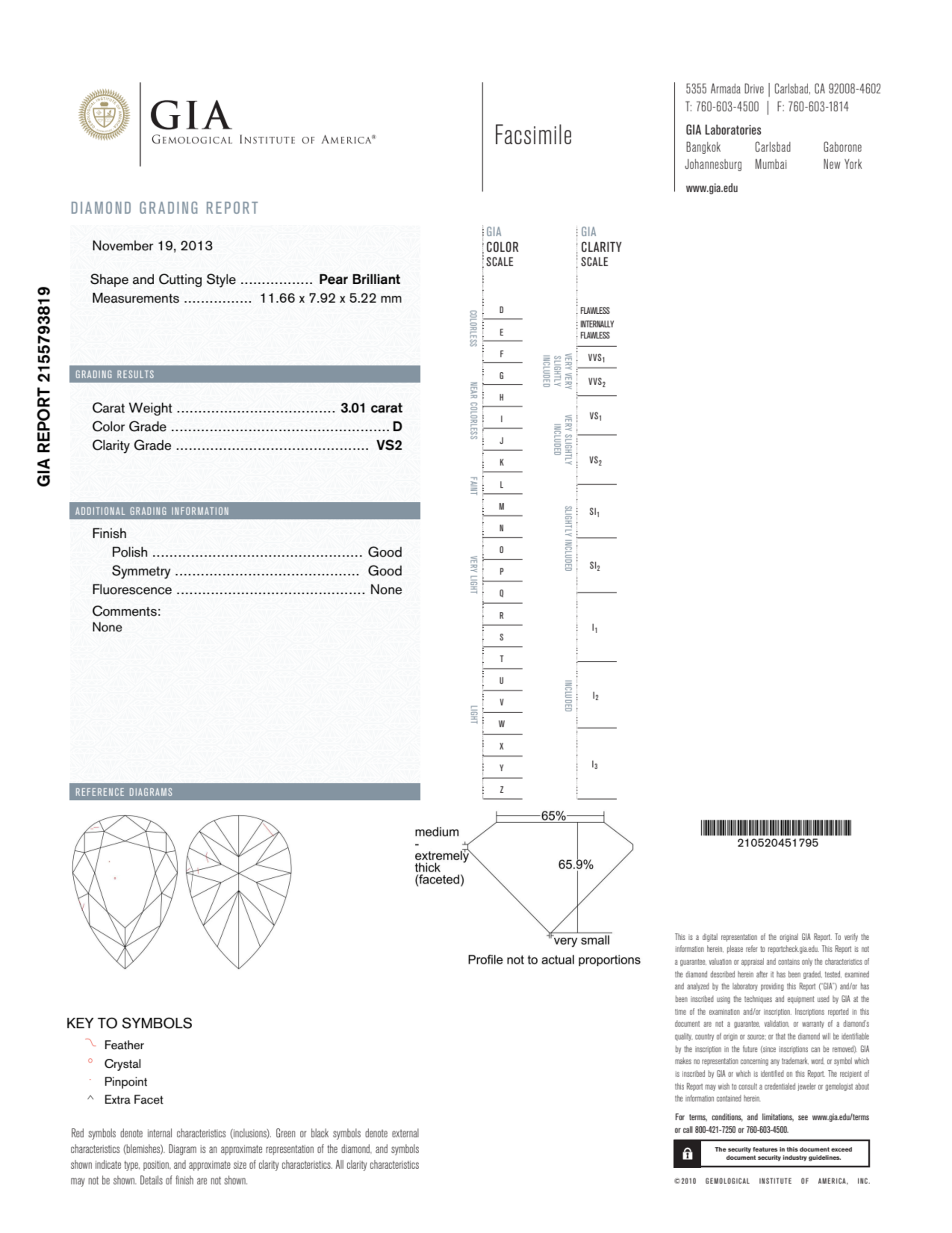 Your 3.01 carat Pear natural diamond is graded D color (Colorless), and you can read more about D color diamonds here.