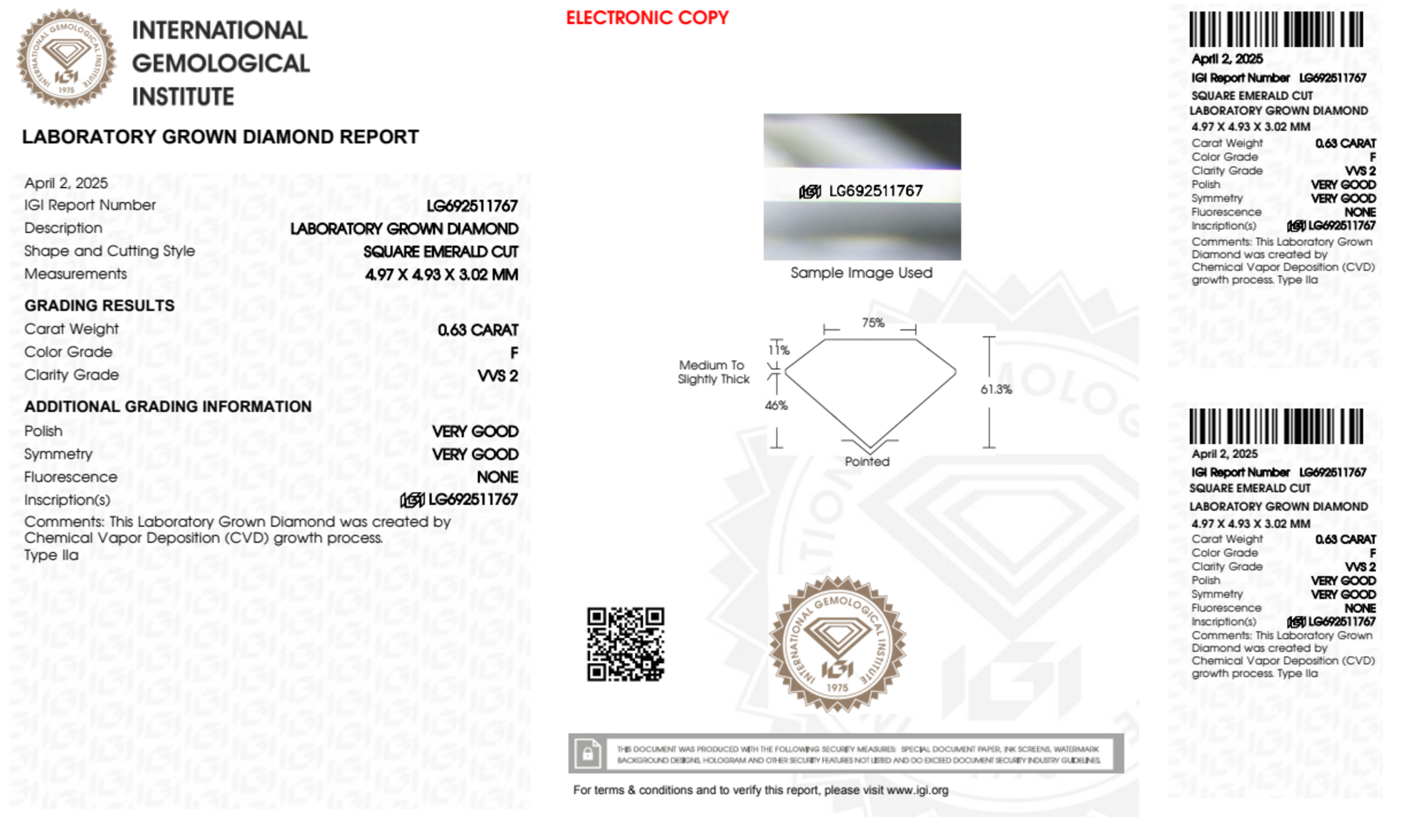 Your 0.63 carat Asscher lab diamond is graded F color (Colorless), and you can read more about F color diamonds here.