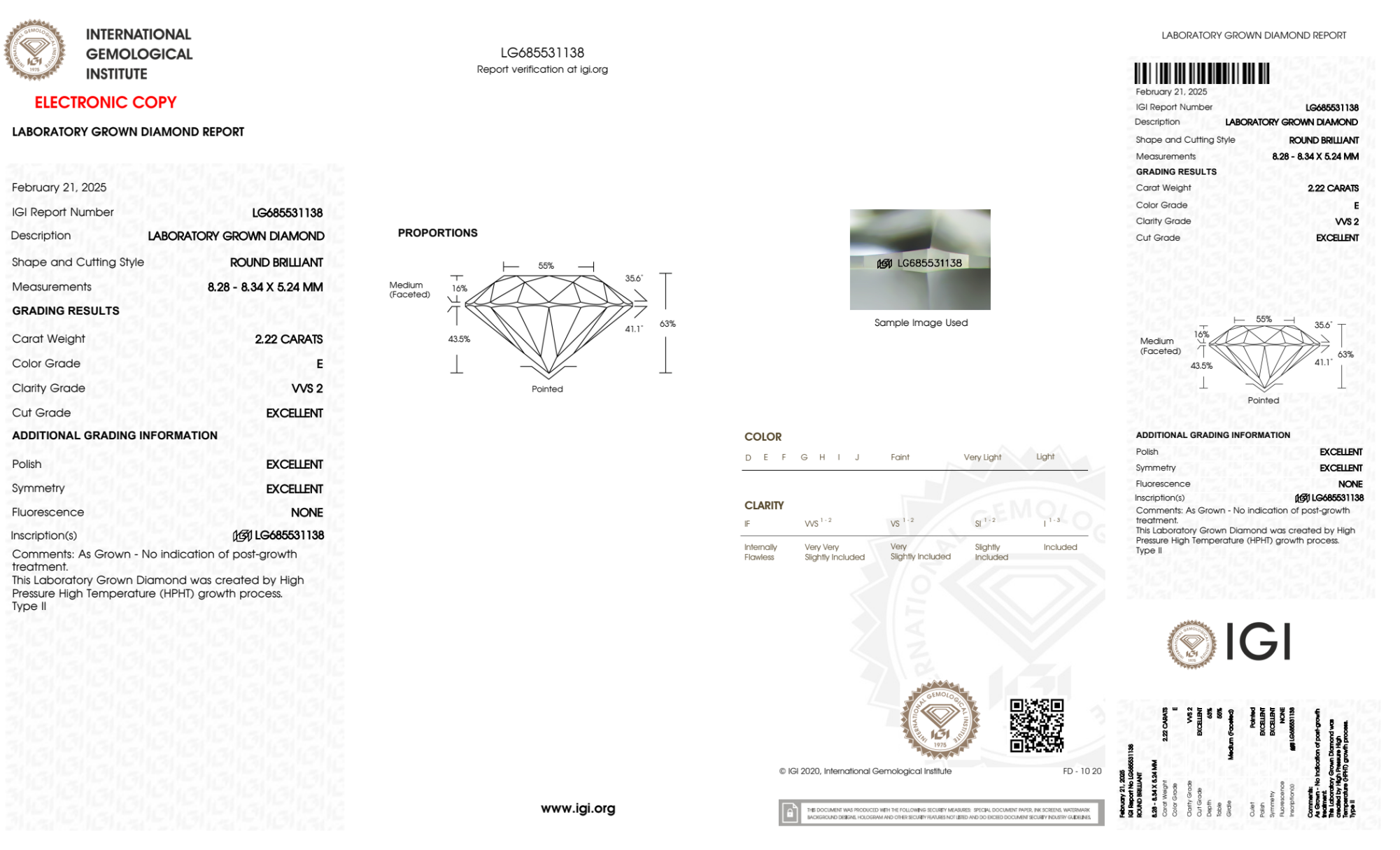 Your 2.22 carat Round lab diamond is graded E color (Colorless), and you can read more about E color diamonds here.