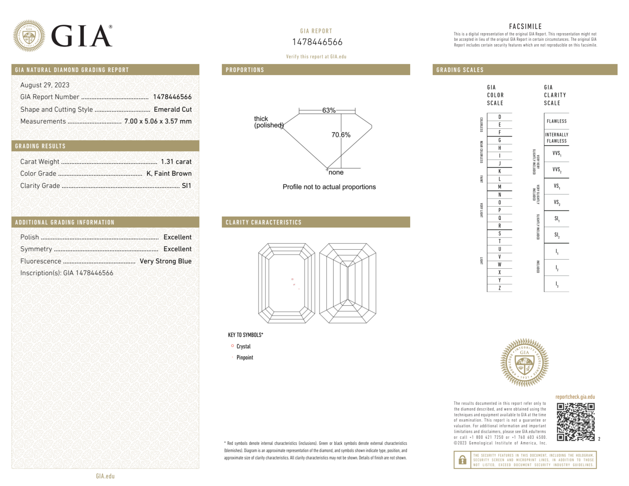 Your 1.31 carat Emerald natural diamond is graded SI1 clarity, which stands for Slightly Included 1. Read more about SI1 clarity diamonds here, or learn more about diamond clarity in general here.