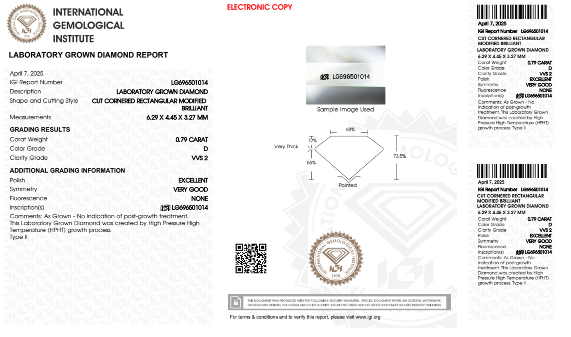 Your 0.79 carat Radiant lab diamond is graded D color (Colorless), and you can read more about D color diamonds here.