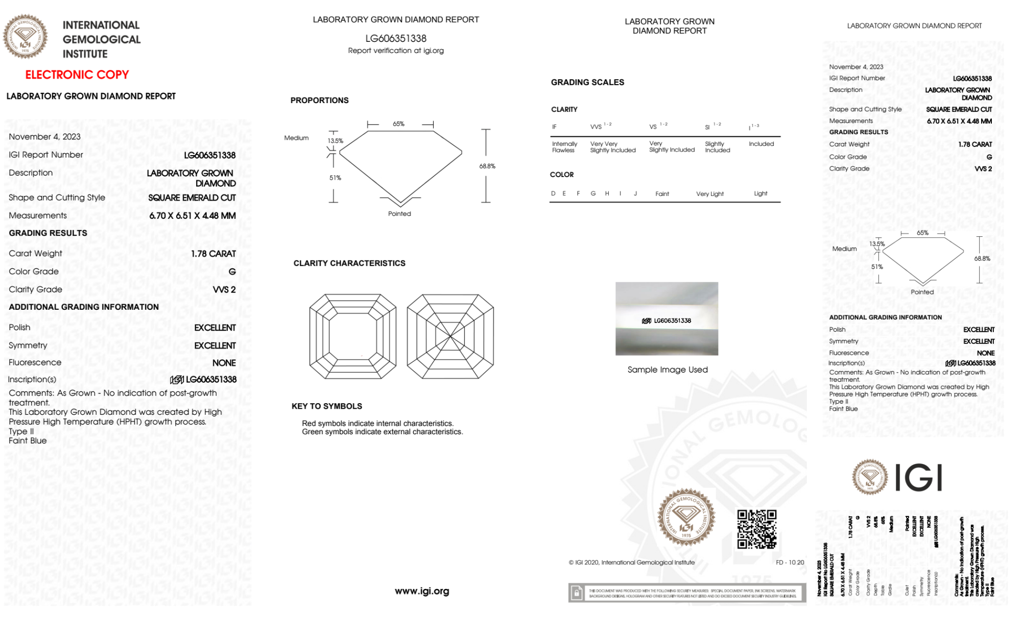 Your 1.78 carat Asscher lab diamond is graded G color (Near Colorless), and you can read more about G color diamonds here.