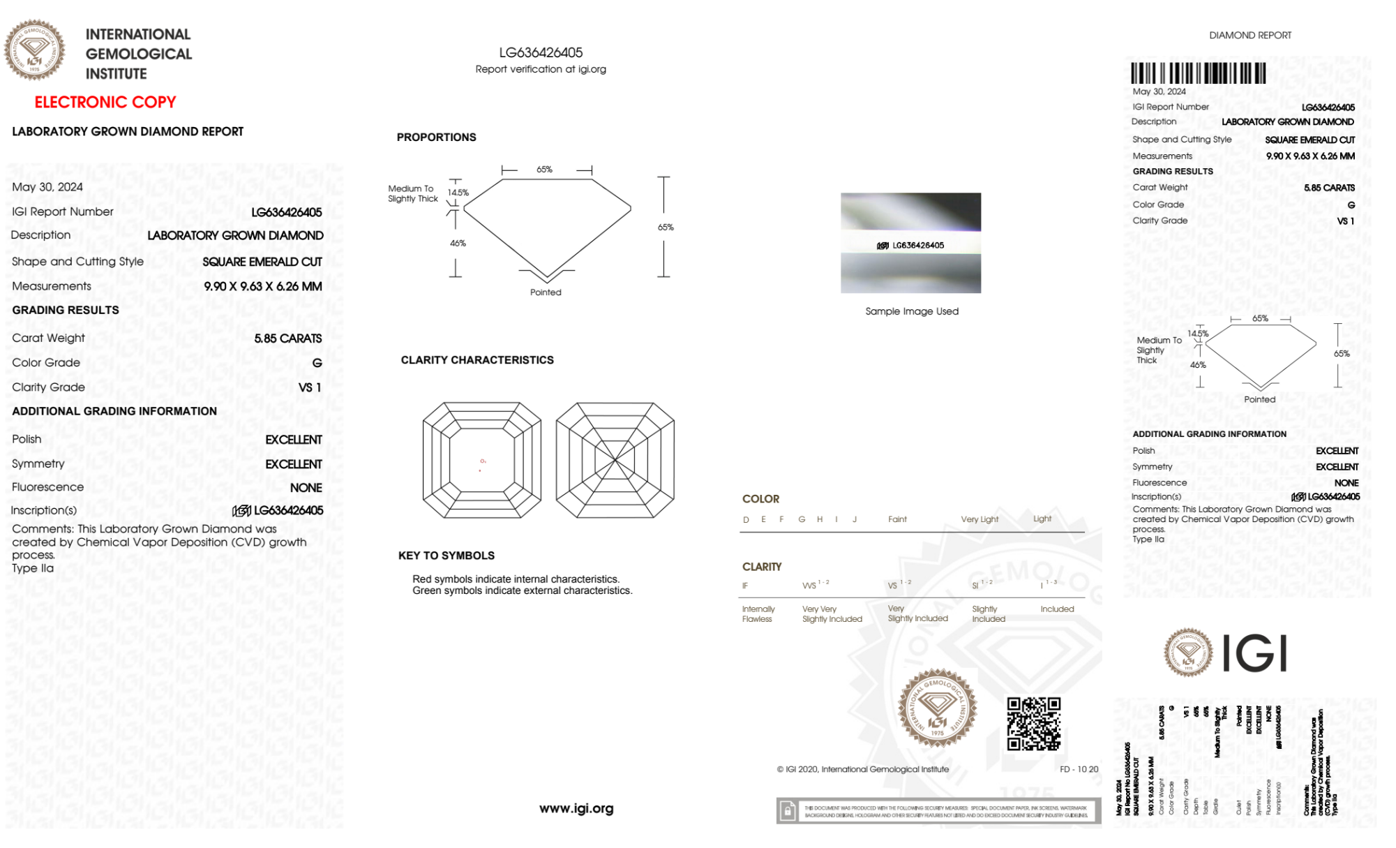 Your 5.85 carat Asscher lab diamond is graded G color (Near Colorless), and you can read more about G color diamonds here.