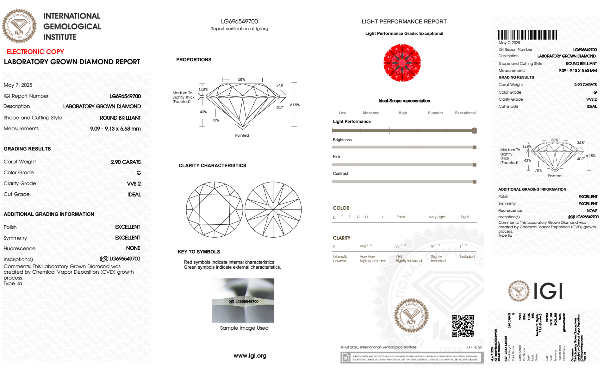 Your 2.90 carat Round lab diamond is graded G color (Near Colorless), and you can read more about G color diamonds here.