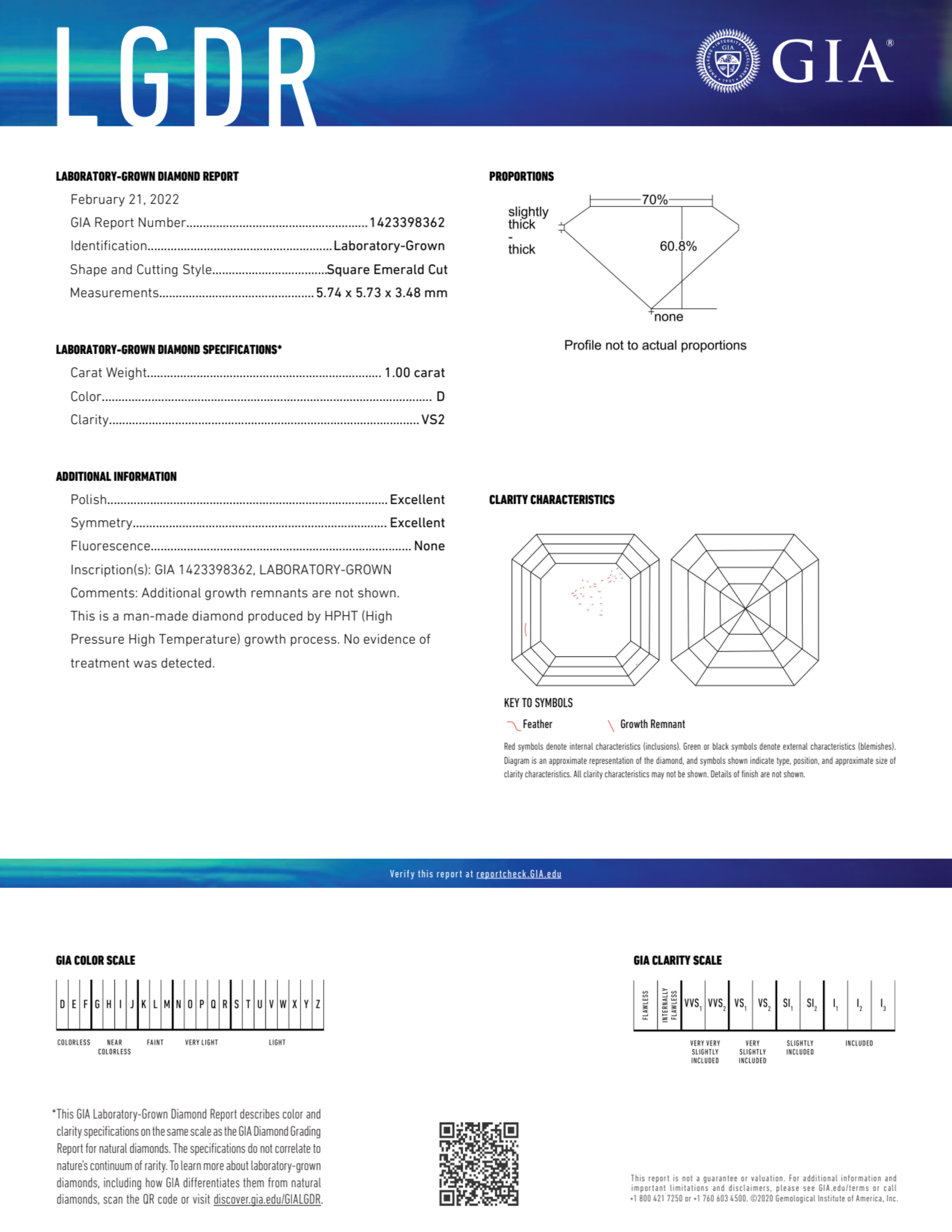 Your 1.00 carat Asscher lab diamond is graded D color (Colorless), and you can read more about D color diamonds here.