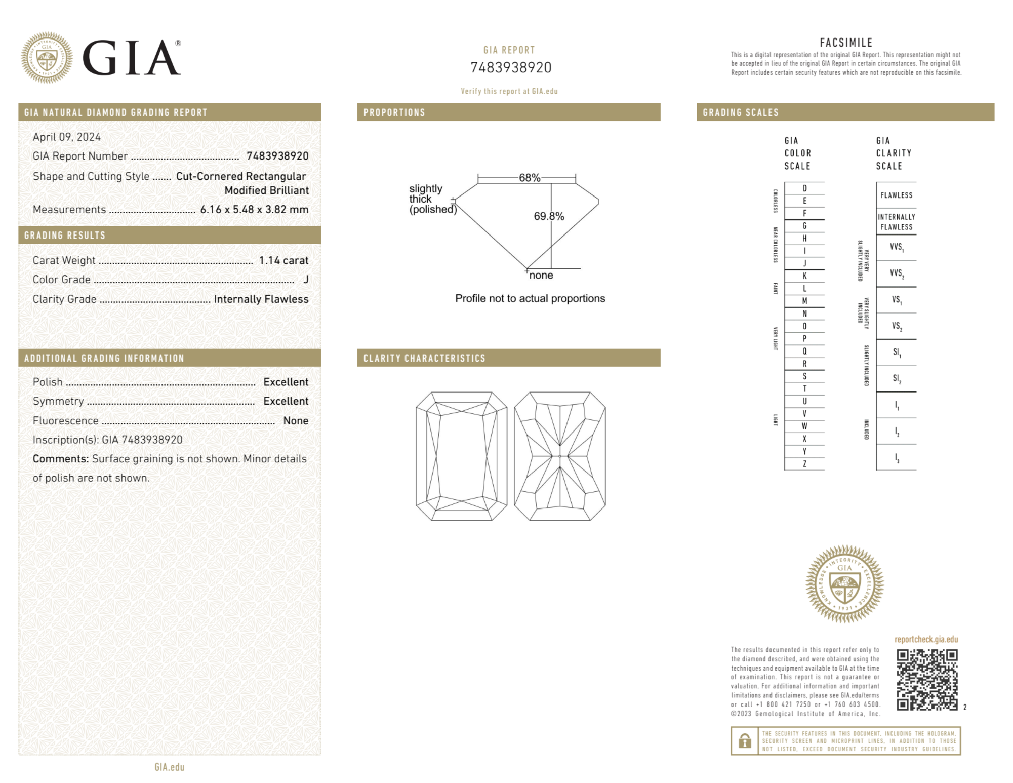 Your 1.14 carat Radiant natural diamond is graded IF clarity, which stands for Internally Flawless. Read more about IF clarity diamonds here, or learn more about diamond clarity in general here.