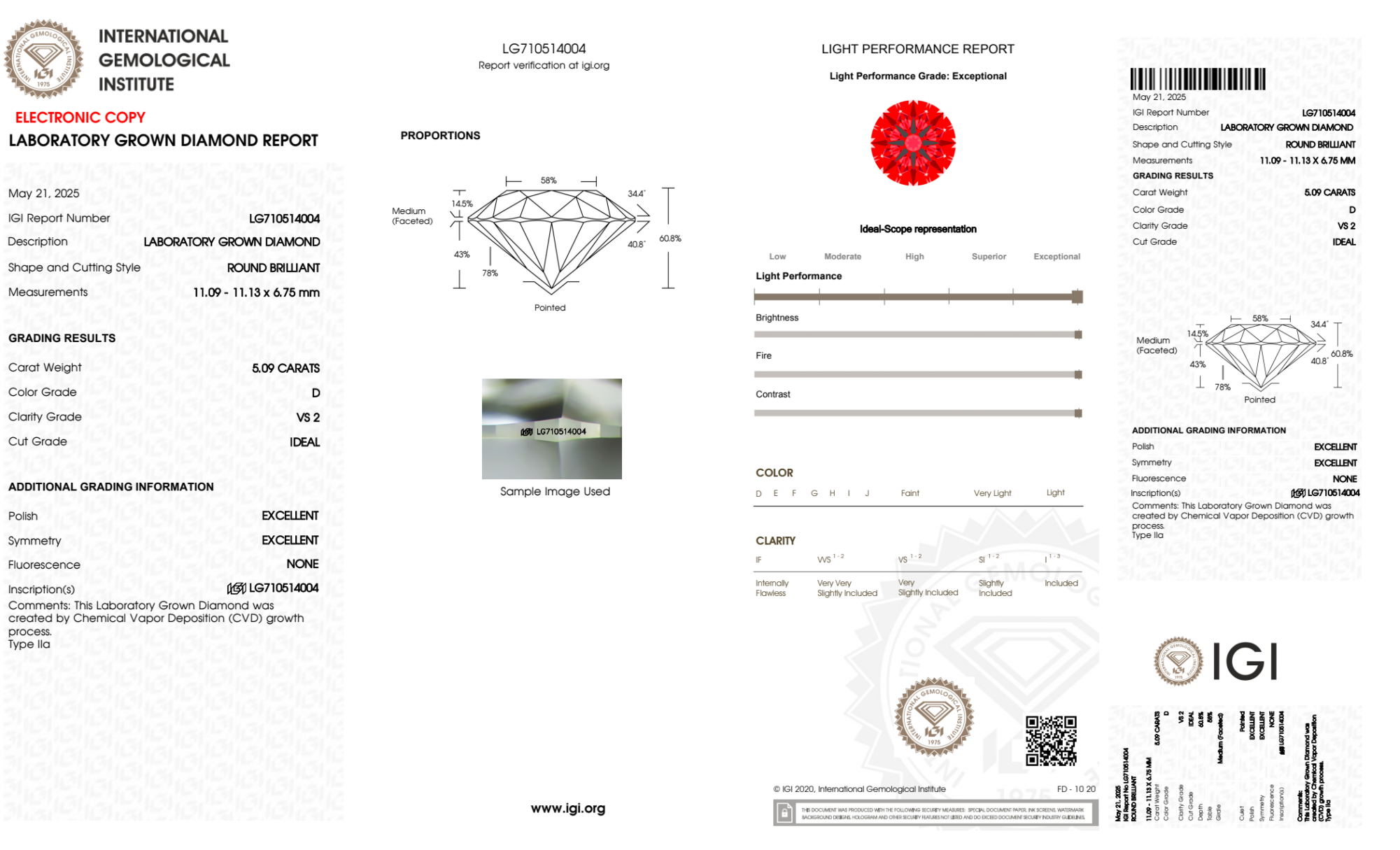 Your 5.09 carat Round lab diamond is graded VS2 clarity, which stands for Very Slightly Included 2. Read more about VS2 clarity diamonds here, or learn more about diamond clarity in general here.