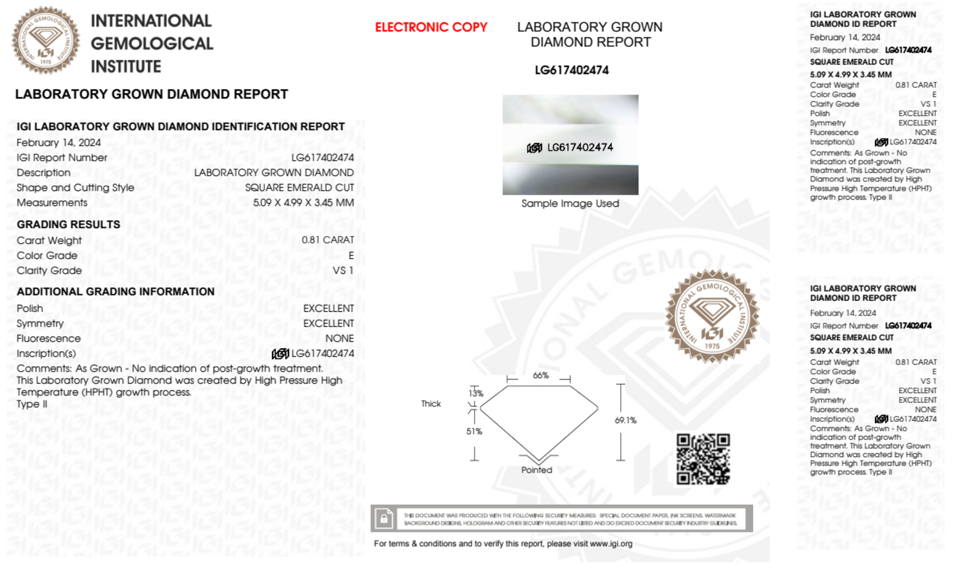 Your 0.81 carat Asscher lab diamond is graded E color (Colorless), and you can read more about E color diamonds here.