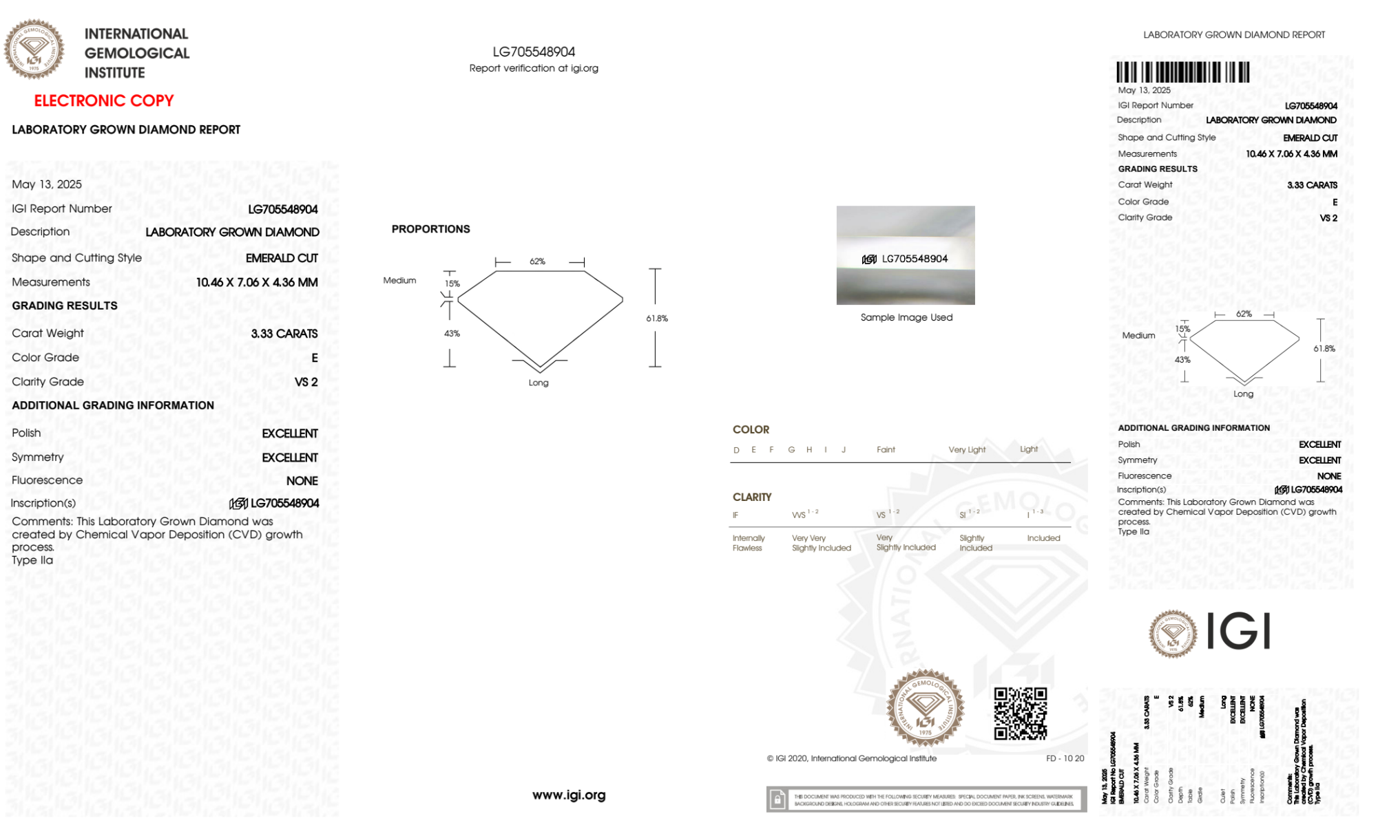 Your 3.33 carat Emerald lab diamond is graded E color (Colorless), and you can read more about E color diamonds here.