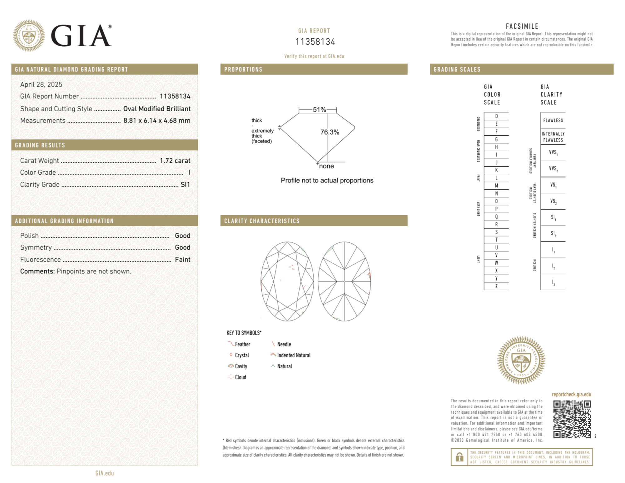 Your 1.72 carat Oval natural diamond is graded SI1 clarity, which stands for Slightly Included 1. Read more about SI1 clarity diamonds here, or learn more about diamond clarity in general here.