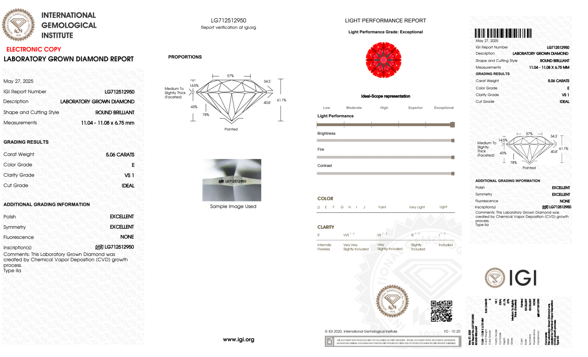 Your 5.06 carat Round lab diamond is graded E color (Colorless), and you can read more about E color diamonds here.