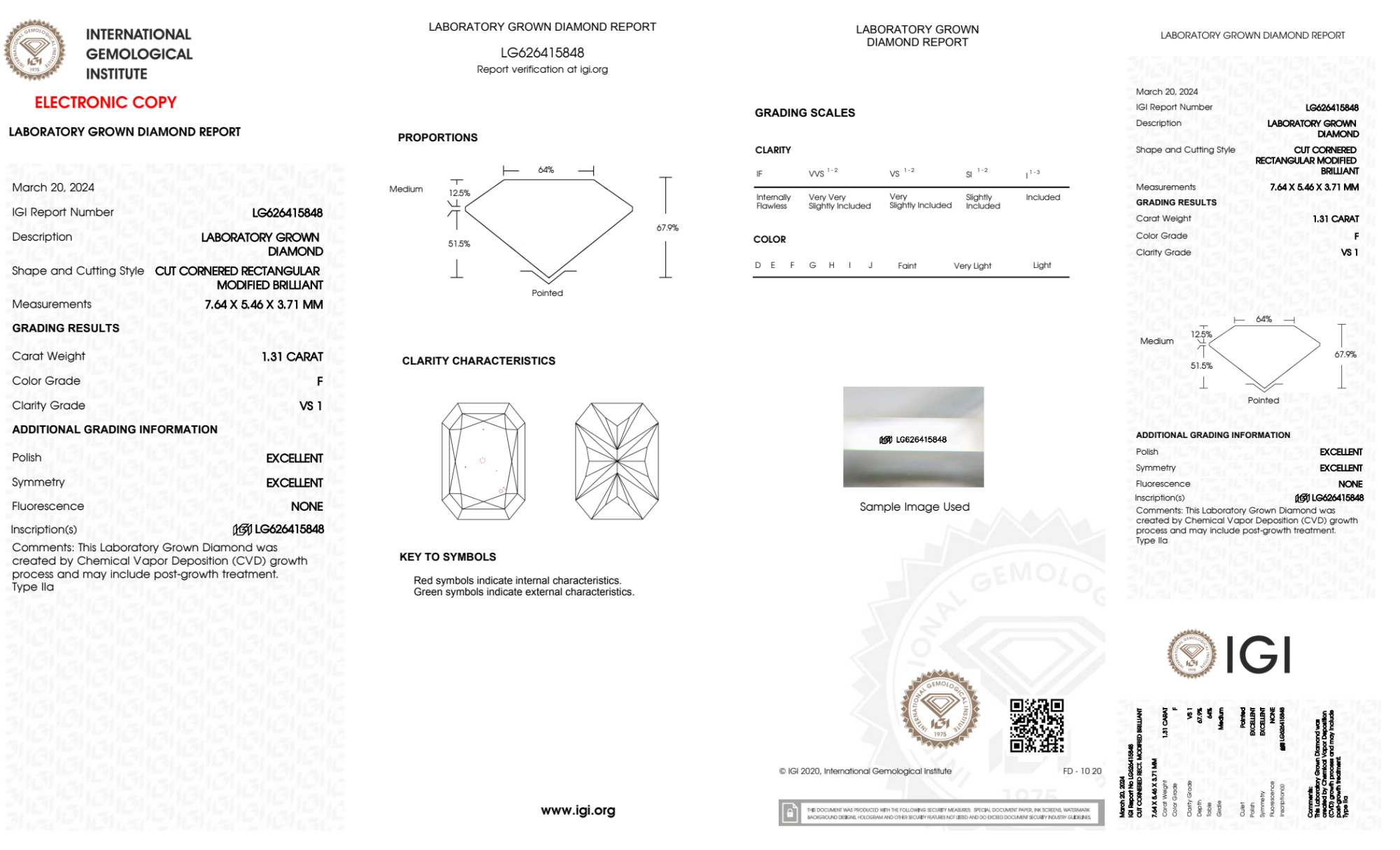 Your 1.31 carat Radiant lab diamond is graded F color (Colorless), and you can read more about F color diamonds here.