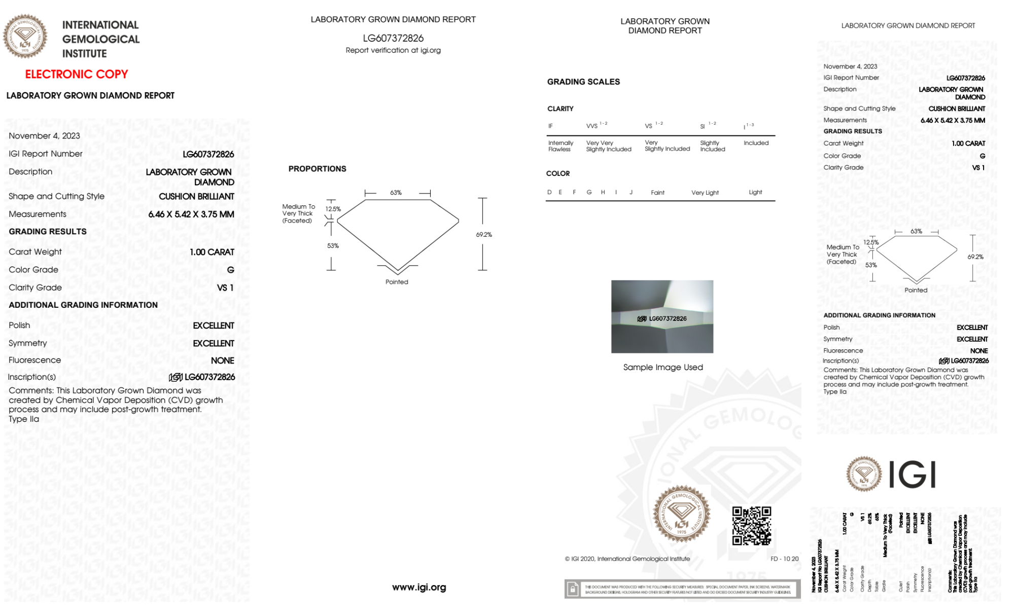Your 1.00 carat Cushion lab diamond is graded G color (Near Colorless), and you can read more about G color diamonds here.